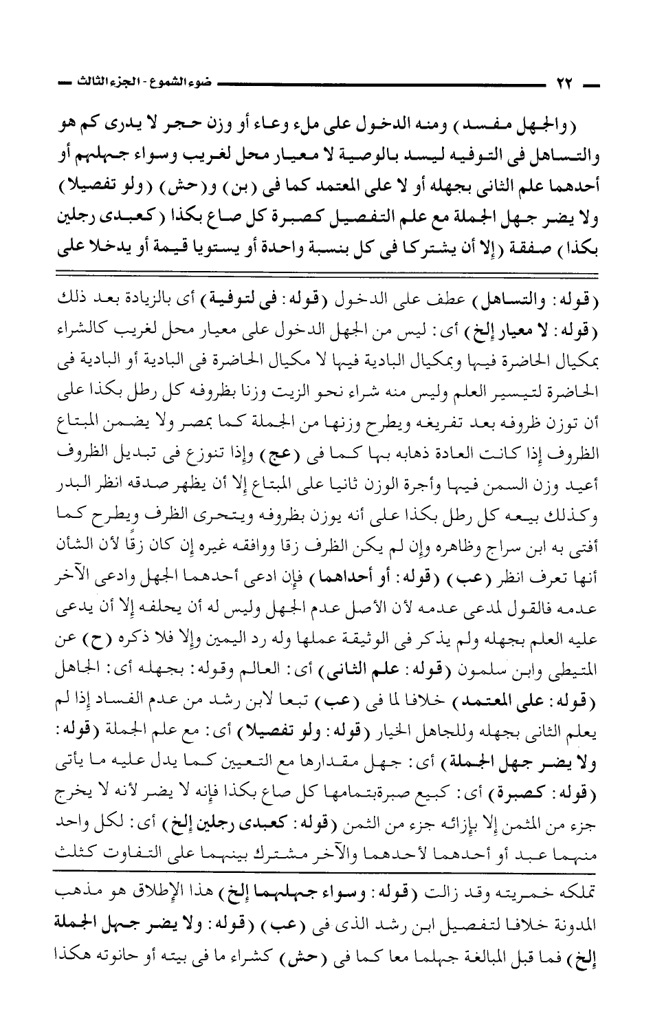 (قوله: والتساهل) عطف على الدخول (قوله: فى لتوفية) أى بالزيادة بعد ذلك (قوله: لا معيار ألخ) أى: ليس من الجهل الدخول على معيار محل لغريب كالشراء بمكيال الحاضرة فيها وبمكيال البادية فيها لا مكيال الحاضر, في البادية أو البادية فى الحاضرة لتيسير العلم وليس منه شراء نحو الزيت وزنا بظ وفه كل رطل بكذا على أن توزن ظروفه بعد تفريغه ويطرح وزنها من الجملة كما بمصر ولا يضمن المبتاع الظروف إذا كانت العادة ذهابه بها كما في (عج) وإذا تتوزع فى تبديل الظروف أعيد وزن السمن فيها وأجرة الوزن ثانيا على المبتاع إلا أن يظهر صدقه انظر البدر وكذلك بيعه كل رطل بكذا على أنه يوزن بظروفه ويتحرى الظرف ويطرح كما أفتى به ابن سراج وظاهره وإن لم يكن الظرف زقا ووافقه غيره إن كان زقًّا لأن الشأن أنها تعرف انظر (عب) (قوله: أو أحداهما) فإن ادعى أحدهما الجهل وادعى الآخر عدمه فالقول لمدعى عدمه لأن الأصل عدم الجهل وليس له أن يحلفه إلا أن يدعى عليه العلم بجهله ولم يذكر فى الوثيقة عمله وله رد اليمين وإلا فلا ذكره (ح) عن المتيطى وابن سلمون (قوله: علم الثانى) أى: العالم وقوله: بجهله أى: الجاهل: (قوله: على المعتمد) خلافا لما فى (عب) تبعا لابن رشد من عدم الفساد إذا لم يعلم الثانى بجهله وللجاهل الخيار (قوله: ولو تفصيلا) أى: مع علم الجملة (قوله: ولا يضر جهل الجملة) أى: جهل مقدارها مع التغيير كما يدل عليه ما يأتى (قوله: كصبرة) أى: كبيع صبرة بتمامها كل صاع بكذا فإنه لا يضر لأنه لا يخرج جزء من المثمن إلا بإزائه جزء من الثمن (قوله: كعبدى رحلين إلخ) أى: لكل واحد منهما عبد أو أحدهما لأحدهما والآخر مشترك بينما على التفاوت كثلث