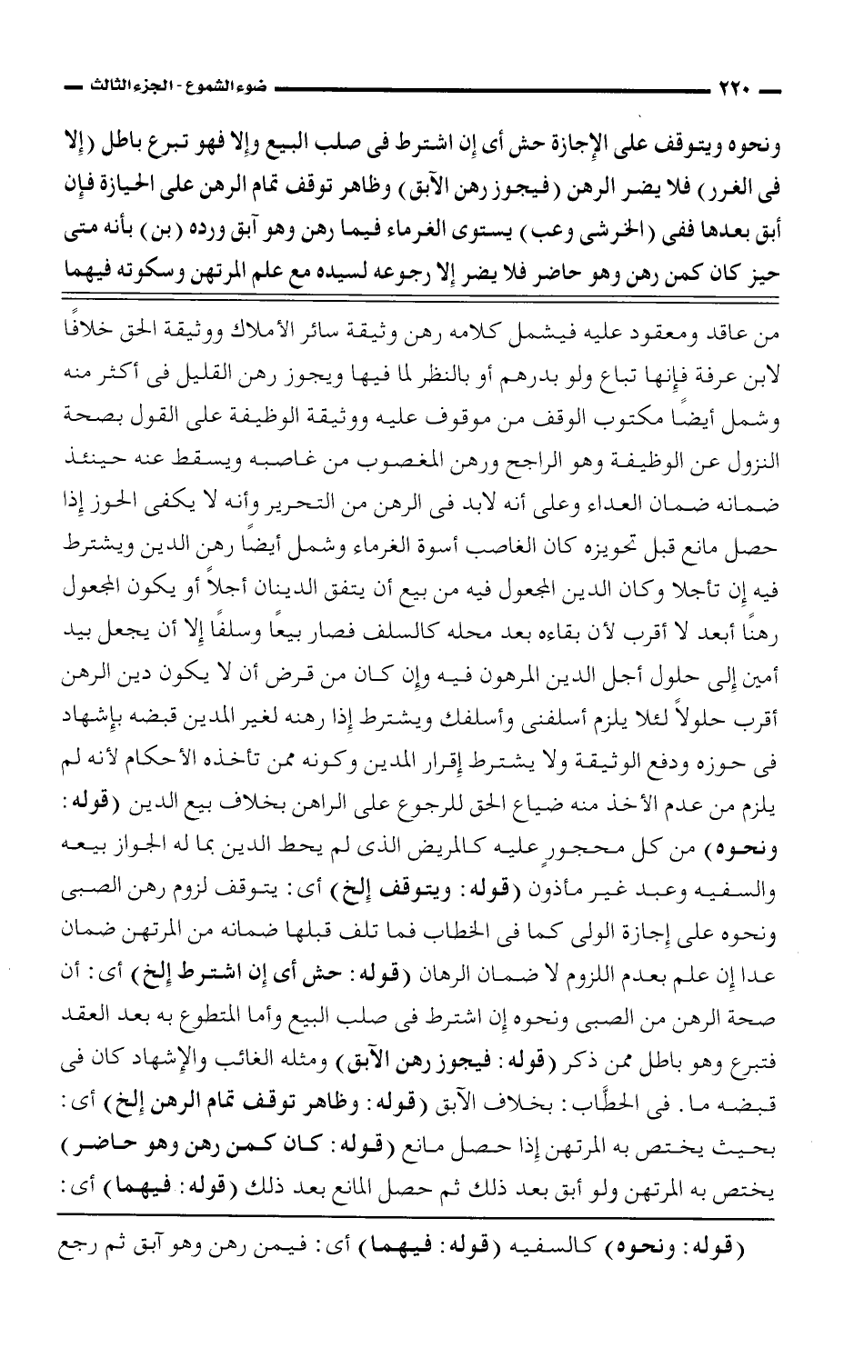 ونحوه ويتوقف على الإجازة حش أى إن اشترط فى صلب البيع وإلا فهو تبرع باطل (إلا فى الغرر) فلا يضر الرهن (فيجوز رهن الآبق) وظاهر توقف تمام الرهن على الحيازة فإن أبق بعدها ففى (الخرشى وعب) يستوى الغرماء فيما رهن وهو آبق ورده (بن) بأنه متى حيز كان كمن رهن وهو حاضر فلا يضر إلا رجوعه لسيده مع علم المرتهن وسكوته فيهما
