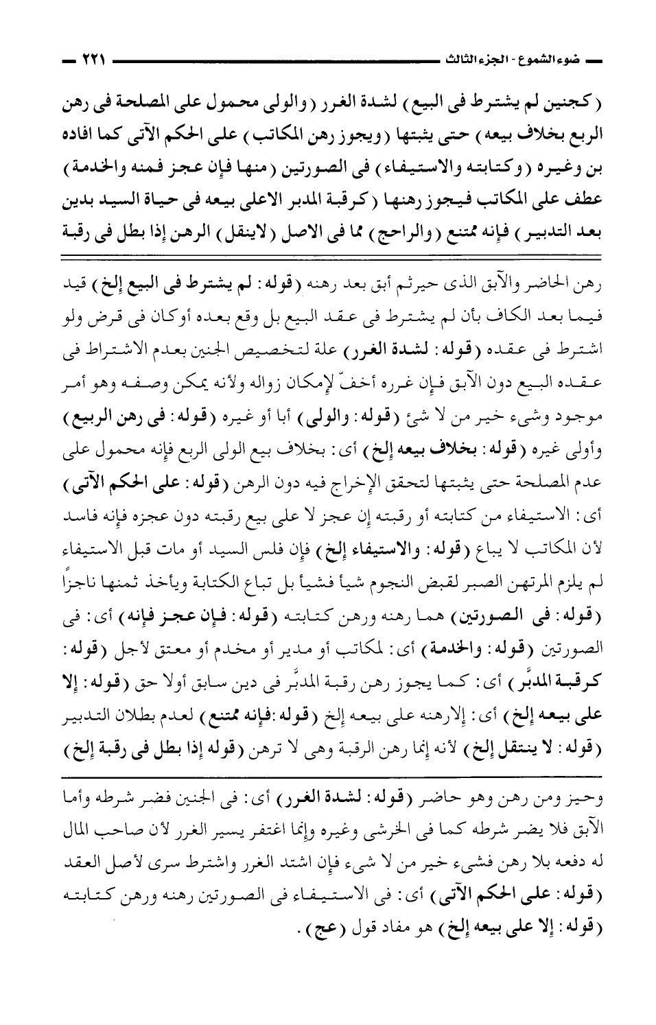 رهن الحاضر والآبق الذي حيرثم أبق بعد رهنه (قوله: لم يشترط فى البيع إلخ) قيد فيما بعد الكاف بأن لم يشترط فى عقد البيع بل وقع بعده أو كان فى قرض ولو اشترط فى عقده (قوله: لشدة الغرر) علة لتخصيص الجنين بعدم الاشتراط فى عقدة البيع دون الآبق فإن غرره أخفّ لإمكان زواله ولأنه يمكن وصفه وهو أمر موجود وشئ خير من لا شئ (قوله: والولى) أبا أو غيره (قوله: فى رهن الربيع) وأولى غيره (قوله: بخلاف بيعه إلخ) أى: بخلاف بيع الولى الربع فإنه محمول على عدم المصلحة حتى يثبتها لتحقق الإخراج فيه دون الرهن (قوله: على الحكم الآتى) أى: الاستيفاء من كتابته أو رقبته إن عجز لا على بيع رقبته دون عجزه فإن فاسد لأن المكاتب لا يباع (قوله: والاستيفاء إلخ) فإن فلس السيد أو مات قبل الاستيفاء لم يلزم المرتهن الصبر لقبض النجوم شيئًا فشيئًا بل تباع الكتابة ويأخذ ثمنها ناجزًا (قوله: فى الصورتين) هما رهنه ورهن كتابته (قوله: فإن عجز فإنه) أى: فى الصورتين (قوله: والخدمة) أى: لمكاتب أو مدير أو مخدم أو معتق لأجل (قوله: كرقبة المدبَّر) أى: كما يجوز رهن رقبة المدبَّر فى دين سابق أو لاحق (قوله: إلا على بيعه إلخ) أى: إلا رهنه على بيعه إلخ (قوله: فإنه ممتنع) لعدم بطلان التدبير (قوله: لا ينتقل إلخ) لأنه إنما رهن الرقبة وهى لا ترهن (قوله إذا بطل فى رقبة إلخ)