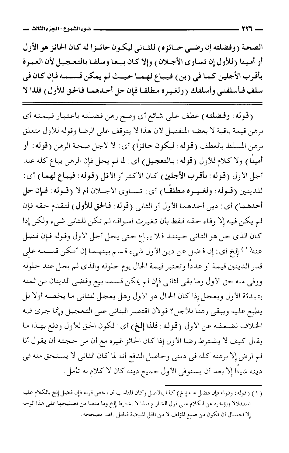 الصحة (وفضلته إن رضى حائزه) للثانى ليكون حائرا له كان الحائز هو الأول أو أمينا (للأول إن تساوى الأجلان) وإلا كان بيعا وسلفا بالتعجيل لأن العبرة بأقرب الأجلين كما فى (بن) فيباع لهما حيث لم يمكن قسمه فإن كان فى سلف فأسلفنى وأسلفك (ولغيره مطلقا فإن حل أحدهما فالحق للأول) فلذا لا