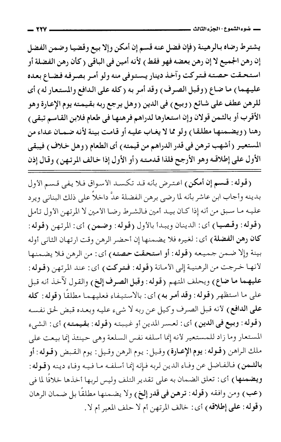 يشترط رضاه بالرهينة (فإن فضل عنه قسم إن أمكن وإلا بيع وقضيا وضمن الفضل إن رهن الجميع لا إن رهن بعضه فهو فقط) لأنه أمين فى الباقى (كأن رهن الفضلة أو استحقت حصته فتركت وآخذ دينار يستوفى منه ولو أمر بصرفه فضاع بعده عليهما) ما ضاع (وقبل الصرف) وقد أمر به (كله على الدافع والمستعار له) أى للرهن عطف على شائع (وبيع) فى الدين (وهل يرجع ربه بقيمته يوم الإعارة وهو الأقرب أو بالثمن قولان وإن استعارها لدراهم فرهنها فى طعام فلابن القاسم تبقى) رهنا (ويضمنها مطلقا) ولو مما لا يغاب عليه أو قامت بينة لأنه ضمان عداء من المستعير (أشهب ترهن فى قدر الدراهم من قيمته) أى الطعام (وهل خلاف) فيبقى الأول على إطلاقه وهو الأرجح فلذا قدمته (أو الأول إذا خالف المرتهن) وقال إذن