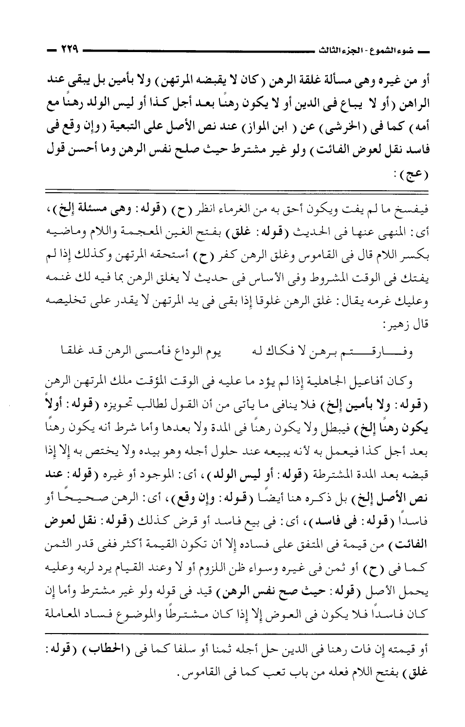 فيفسخ ما لم يفت ويكون أحق به من الغرماء انظر (ح) (قوله: وهى مسئلة إلخ) , أى: المنهى عنها فى الحديث (قوله: غلق) بفتح الغين المعجمة واللام وماضيه بكسر اللام قال فى القاموس وغلق الرهن كفر (ح) استحقه المرتهن وكذلك إذا لم يفتك فى الوقت المشروط وفى الأساس فى حديث لا يغلق الرهن بما فيه لك غنمه وعليك غرمه يقال: غلق الرهن غلوقا إذا بقى فى يد المرتهن لا يقدر على تخليصه قال زهير: