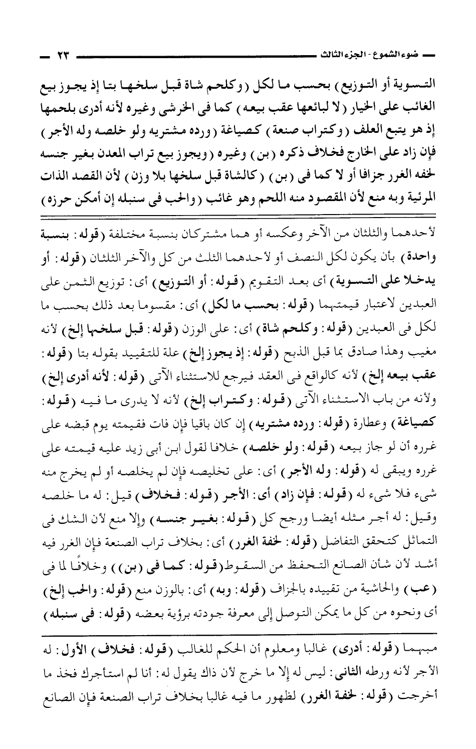 التسوية أو التوزيع) بحسب ما لكل (وكلحم شاة قبل سلخها بتا إذ يجوز بيع الغائب على الخيار (لا لبائعها عقب بيعه) كما فى الخرشى وغيره لأنه أدرى بلحمها إذ هو يتبع العلف (وكتراب صنعة) كصياغة (ورده مشتريه ولو خلصه وله الأجر) فإن زاد على الخارج فخلاف ذكره (بن) وغيره (ويجوز بيع تراب المعدن بغير جنسه لخفه الغرر جزافا أو لا كما فى (بن) (كالشاة قبل سلخها بلا وزن) لأن القصد الذات المرئية وبه منع لأن المقصود منه اللحم وهو غائب (والحب فى سنبله إن أمكن حرزه)