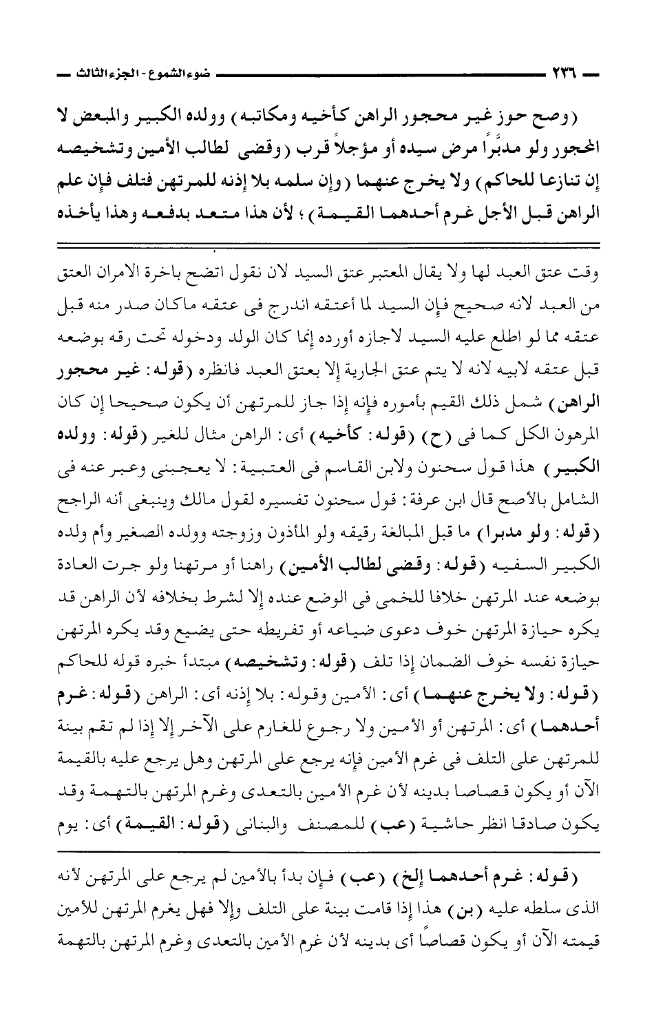 وقت عتق العبد لها ولا يقال المعتبر عتق السيد لان نقول اتضح باخرة الامران العتق من العبد لانه صحيح فإن السيد لما أعتقه اندرج فى عتقه ما كان صدر منه قبل عتقه مما لو اطلع عليه السيد لاجازه أورده إنما كان الولد ودخوله تحت رقه بوضعه قبل عتقه لابيه لانه لا يتم عتق الجارية إلا بعتق العبد فانظره (قوله: غير محجور الراهن) شمل ذلك القيم بأموره فإنه إذا جاز للمرتهن أن يكون صحيحا إن كان المرهون الكل كما فى (ح) (قوله: كأخيه) أى: الراهن مال للغير (قوله: وولده الكبير) هذا قول سحنون ولابن القاسم فى العتبية: لا يعجبنى وعبر عنه فى الشامل بالأصح قال ابن عرفة: قول سحنون تفسيره لقول مالك وينبغى أنه الراجح (قوله: ولو مدبرا) ما قبل المبالغة رقيقه ولو المأذون وزوجته وولده الصغير وأم ولده الكبير السفيه (قوله: وقضى لطالب الأمين) راهنا أو مرتهنا ولو جرت العادة بوضعه عند المرتهن خلافا للخمى فى الوضع عنده إلا لشرط بخلافه لأن الراهن قد يكره حيازة المرتهن خوف دعوى ضياعه أو تفريطه حتى يضيع وقد يكره المرتهن حيازة نفسه خوف الضمان إذا تلف (قوله: وتشخيصه) مبتدأ خبره قوله للحاكم (قوله: ولا يخرج عنهما) أى: الأمين وقوله: بلا إذنه أى: الراهن (قوله: غرم أحدهما) أى: المرتهن أو الأمين ولا رجوع للغارم على الآخر إلا إذا لم تقم بينة للمرتهن على التلف فى غرم الأمين فإنه يرجع على المرتهن وهل يرجع عليه بالقيمة الآن أو يكون قصاصا بدينه لأن غرم الأمين بالتعدى وغرم المرتهن بالتهمة وقد يكون صادقا انظر حاشية (عب) للمصنف والبنانى (قوله: القيمة) أى: يوم