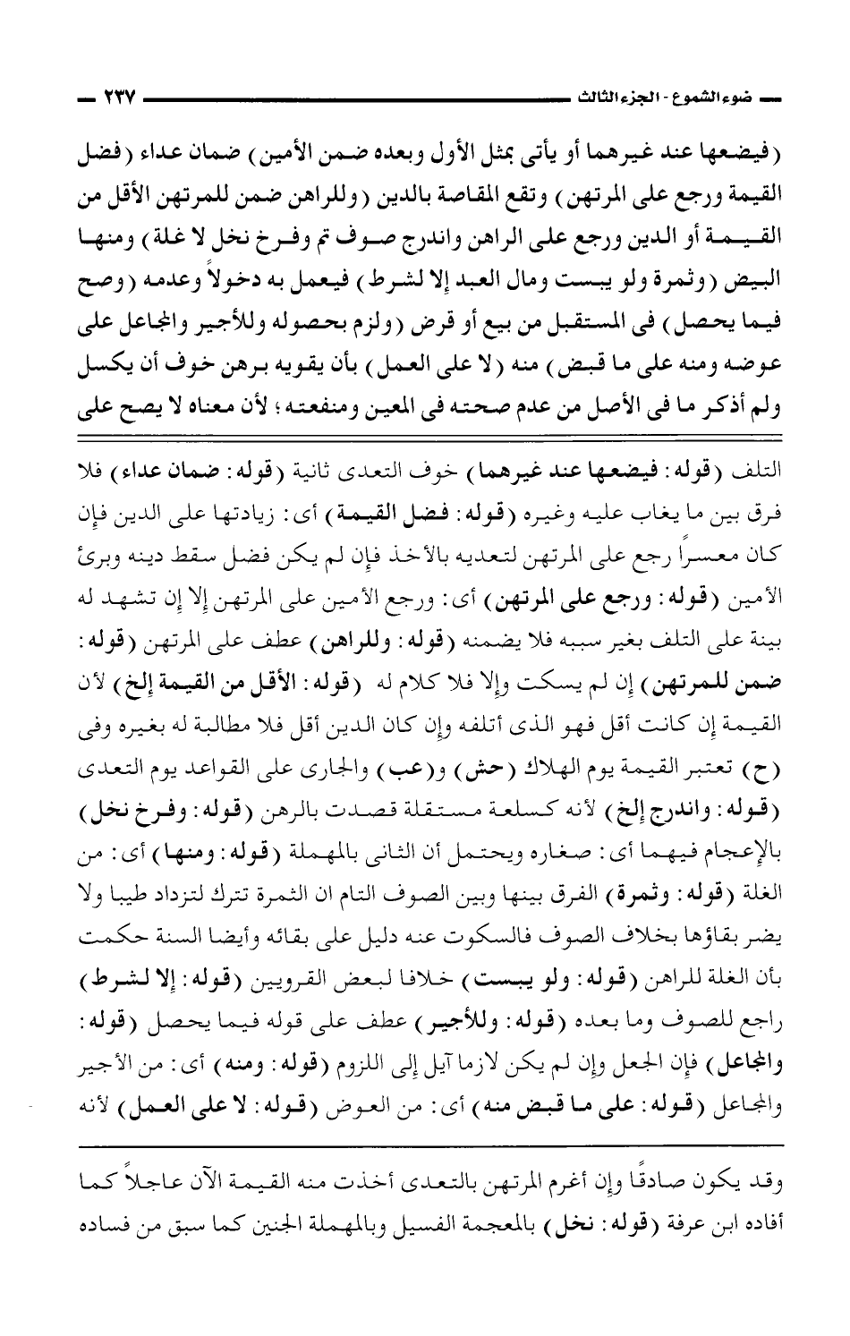 (فيضعها عند غيرهما أو يأتى بمثل الأول وبعده ضمن الأمين) ضمان عداء (فضل القيمة ورجع على المرتهن) وتقع المقاصة بالدين (وللرااهن ضمن للمرتهن الأقل من القيمة أو الدين ورجع على الراهن واندرج صوف تم وفرخ نخل لا غلة) ومنها البيض (وثمرة ولو يبست ومال العبد إلا لشرط) فيعمل به دخولًا وعدمه (وصح فيما يحصل) فى المستقبل من بيع أو قرض (ولزم بحصوله وللأجير والمجاعل على عوضه منه على ما قبض) منه (لا على العمل) بأن يقويه برهن خوف أن يكسل ولم أذكر ما فى الأصل من عدم صحته فى المعين ومنفعته؛ لأن معناه لا يصح على