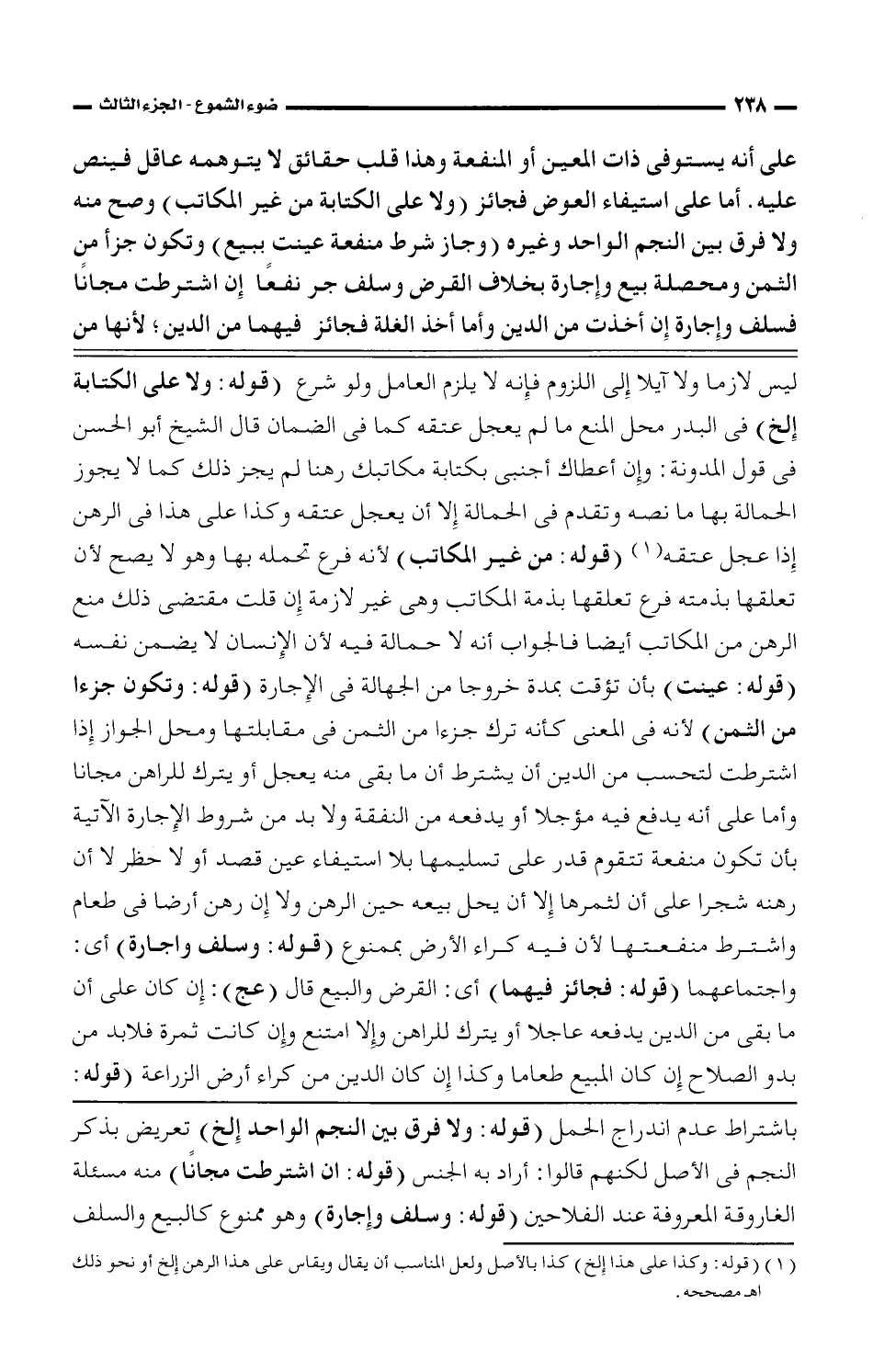 على أنه يستوفى ذات المعين أو المنفعة وهذا قلب حقائق لا يتوهمه عاقل فيص عليه. أما على استيفاء العوض فجائز (ولا على الكتابة من غير المكاتب) وصح منه ولا فرق بين النحم الواحد وغيره (وجاز شرط منفعة عينت ببيع) وتكون جزأ من الثمن ومحصلة بيع وإجارة بخلاف القرض وسلف جر نفعًا إن اشترطت مجانًا فسلف وإجارة إن أخذت من الدين وأما أخذ الغلة فجائز فيهما من الدين؛ لأنها من