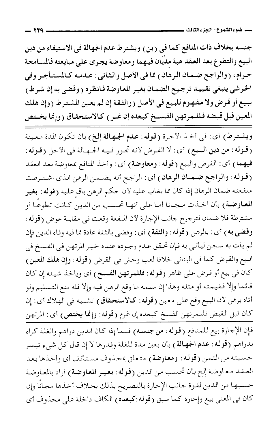 (ويشترط) أى: فى أخذ الأجرة (قوله: عدم الجهالة إلخ) بأن تكون المدة معينة (قوله: من دين البيع) أى: لا القرض لأنه تجوز فيه الجهالة فى الأجل (قوله: فيهما) أى: القرض والبيع (قوله: ومعاوضة) أى: وأخذ المنافع بمعاوضة بعد العقد (قوله: والراجح ضمان الرهان) أى: الراجح أنه يضمن الرهن الذى اشترطت منفعته ضمان الرهان إذا كان مما يغاب عليه لأن حكم الرهن باقٍ عليه (قوله: بغير المعاوضة) بأن أخذت مجانا أما على أنها تحسب من الدين كانت تطوعًا أو مشترطة فلا ضمان لترجيح جانب الإجارة لأن المنفعة وقعت فى مقابلة عوض (قوله: وقضى به) أى: بالرهن (قوله: والثقة) أى: وقضى بالثقة عادة مما فيه وفاء الدين فإن لم يأت به سجن ليأتى به فإن تحقق عدم وجوده عند خير المرتهن فى الفسخ فى البيع والقرض كما فى البنانى خلافا لعب وحش فى القرض (قوله: وإن هلك المعين) كان فى بيع أو قرض على ظاهر (قوله: فللمرتهن الفسخ) أى ويأخذ شيئه إن كان قائما وإلا فيمته أو مثله وهذا إن سلمه ما وقع الرهن فيه وإلا فله منع التسليم ولو أتاه برهن لأن البيع وقع على معين (قوله: كالاستحقاق) تشبيه فى الهلاك أى: إن كان قبل القبض فللمرتهن الفسخ كبعده إن غرم (قوله: وإنما يختص) أى: المرتهن