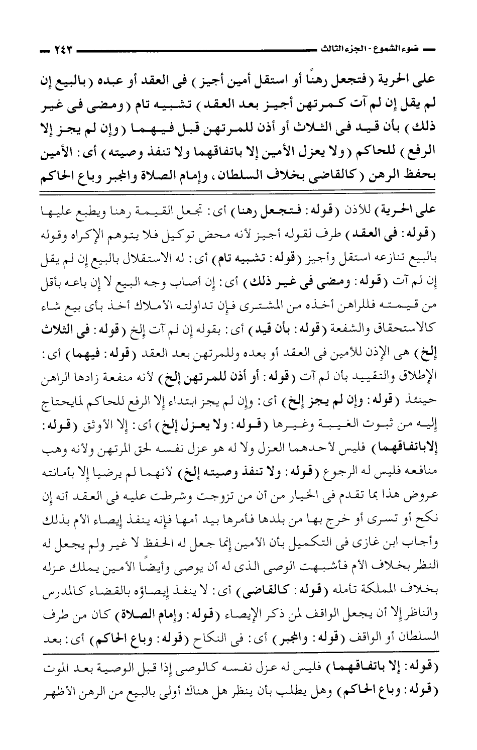 على الحرية (فتجعل رهنًا أو استقل أمين أجيز) فى العقد أو عبده (بالبيع إن لم يقل إن لم آت كمرتهن أجيز بعد العقد) تشبيه تام (ومضى فى غير ذلك) بأن قيد فى الثلاث أو أذن للمرتهن قبل فيهما (وإن لم يجز إلا الرفع) للحاكم (ولا يعزل الأمين إلا باتفاقهما ولا تنفذ وصيته) أى: الأمين بحفظ الرهن (كالقاضى بخلاف السلطان, وإمام الصلاة والمجبر وباع الحاكم