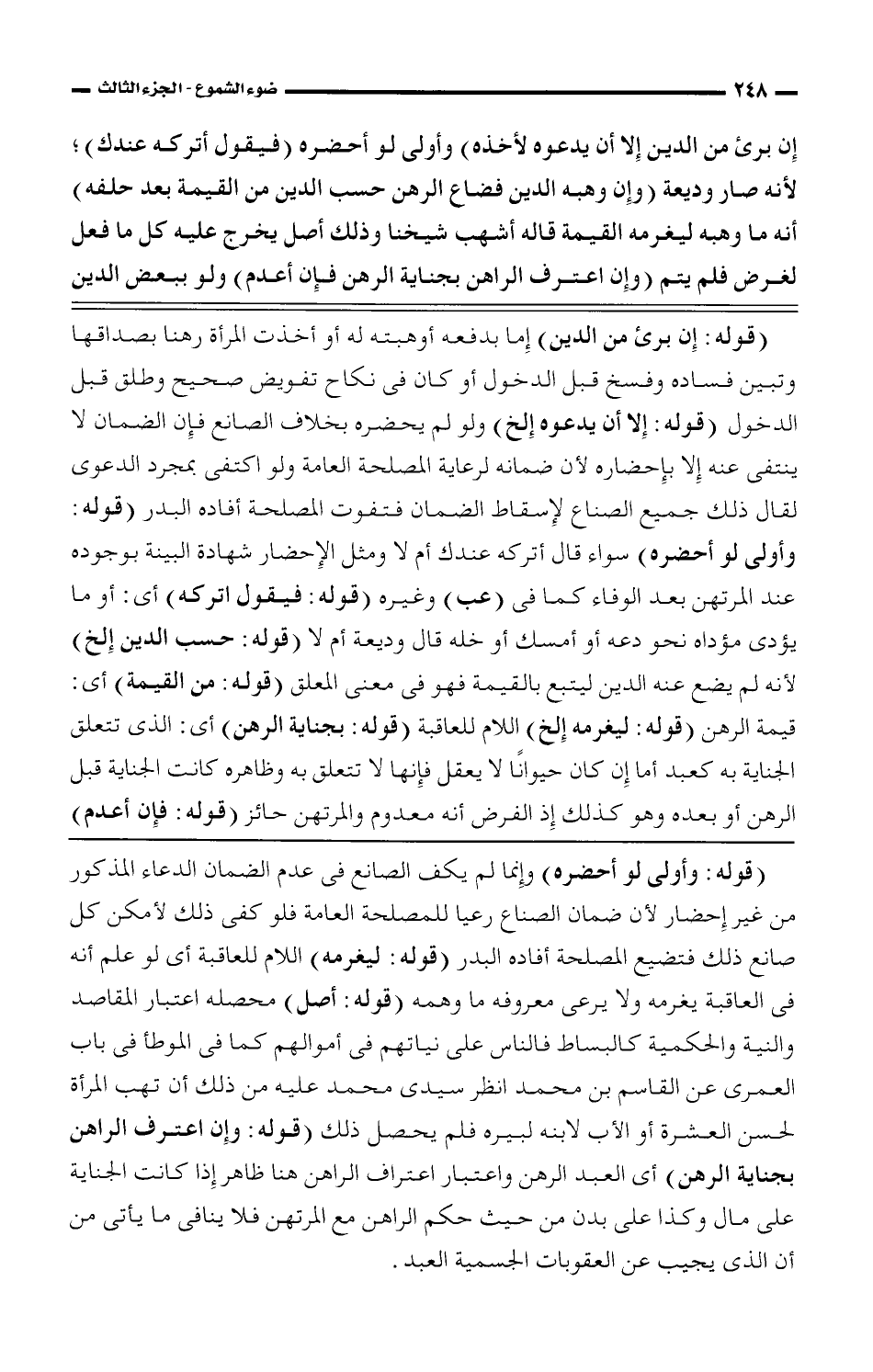(قوله: وأولى لو أحضره) وإنما لم يكف الصانع فى عدم الضمان الدعاء المذكور من غير إحضار لأن ضمان الصناع رعيا للمصلحة العامة فلو كفى ذلك لأمكن كل صانع ذلك فتضيع المصلحة أفاده البدر (قوله: ليغرمه) اللام للعاقبة أى لو علم أنه فى العاقبة يغرمه ولا يرعى معروفه ما وهمه (قوله: أصل) محصله اعتبار المقاصد والنية والحكمية كالبساط فالناس على نياتهم فى أموالهم كما فى الموطأ فى باب العمرى عن القاسم بن محمد انظر سيدى محمد عليه من ذلك أن تهب المرأة لحسن العشرة أو الأب لابنه لبيره فلم يحصل ذلك (قوله: وإن اعترف الراهن بجناية الرهن) أى العبد الرهن واعتبار اعتراف الراهن هنا ظاهر إذا كانت الجناية على مال وكذا على بدن من حيث حكم الراهن مع المرتهن فلا ينافى ما يأتى من أن الذى يجيب عن العقوبات الجسمية العبد.