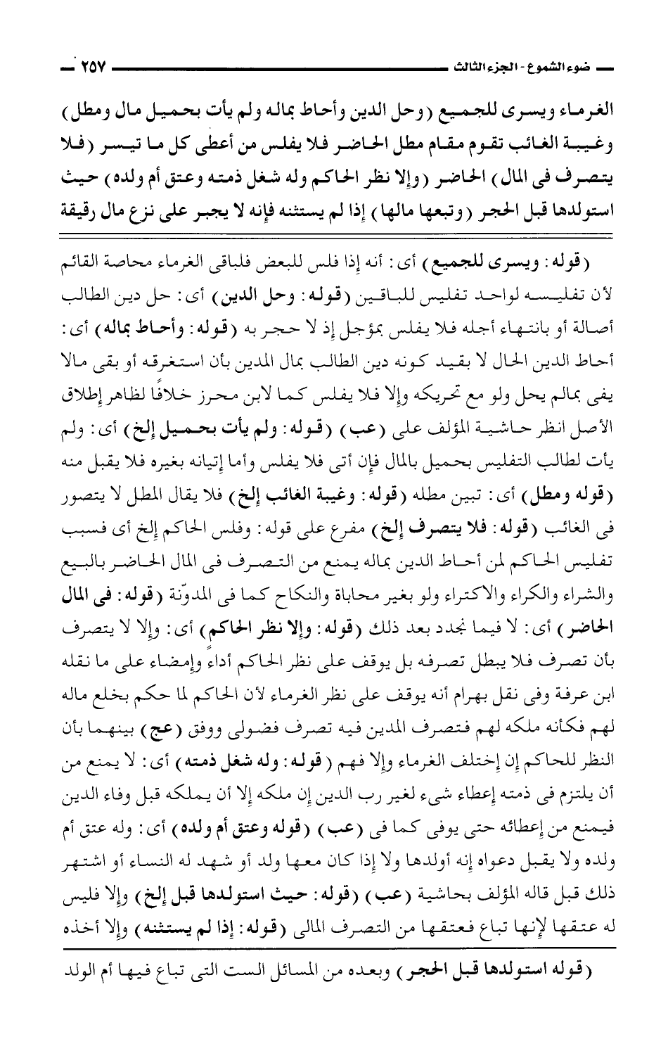 الغرماء ويسرى للجميع (وحل الدين وأحاط بماله ولم يأت بحميل مال ومطل) وغيبة الغائب تقوم مقام مطل الحاضر فلا يفلسي من أعطى كل ما تيسر (فلا يتصرف فى المال) الحاضر (وإلا نظر الحاكم وله شغل ذمته وعتق أم ولده) حيث استولدها قبل الحجر (وتبعها مالها) إذا لم يسثنه فإنه لا يجبر على نزع مال رقيقة