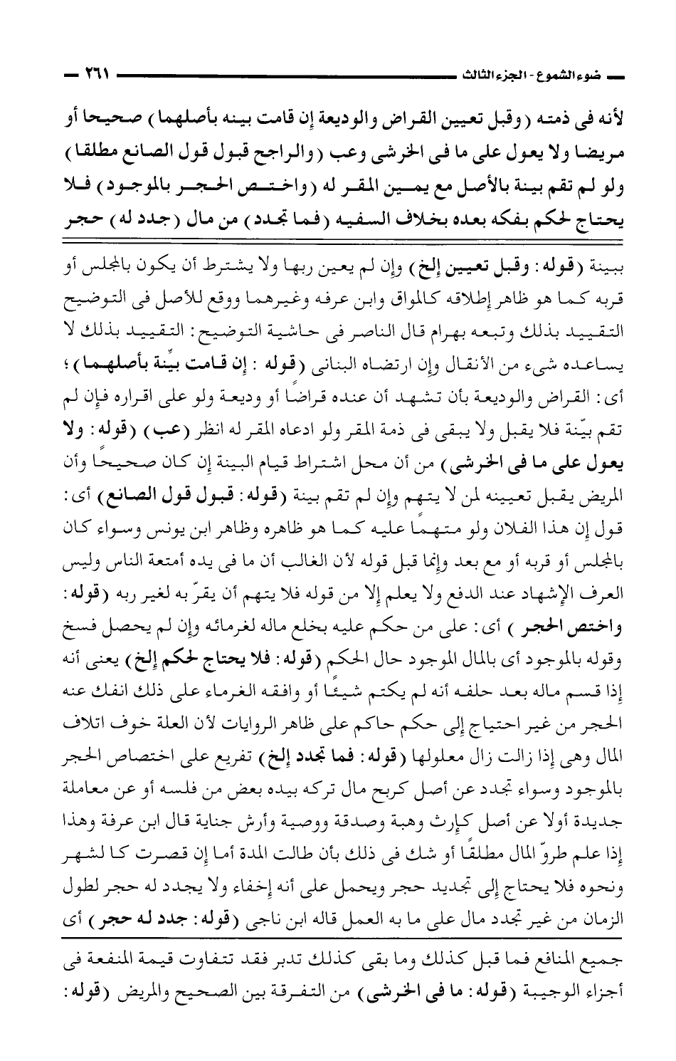 لأنه فى ذمته (وقبل تعيين القراض والوديعة إن قامت بينه بأصلهما) صحيحا أو مريضا ولا يعول على ما فى الخرشى وعب (والراجح قبول قول الصانع مطلقا) ولو لم تقم بينة بالأصل مع يمين المقر له (واختص الحجر بالموجود) فلا يحتاج لحكم بفكه بعده بخلاف السفيه (فما تجدد) من مال (جدد له) حجر