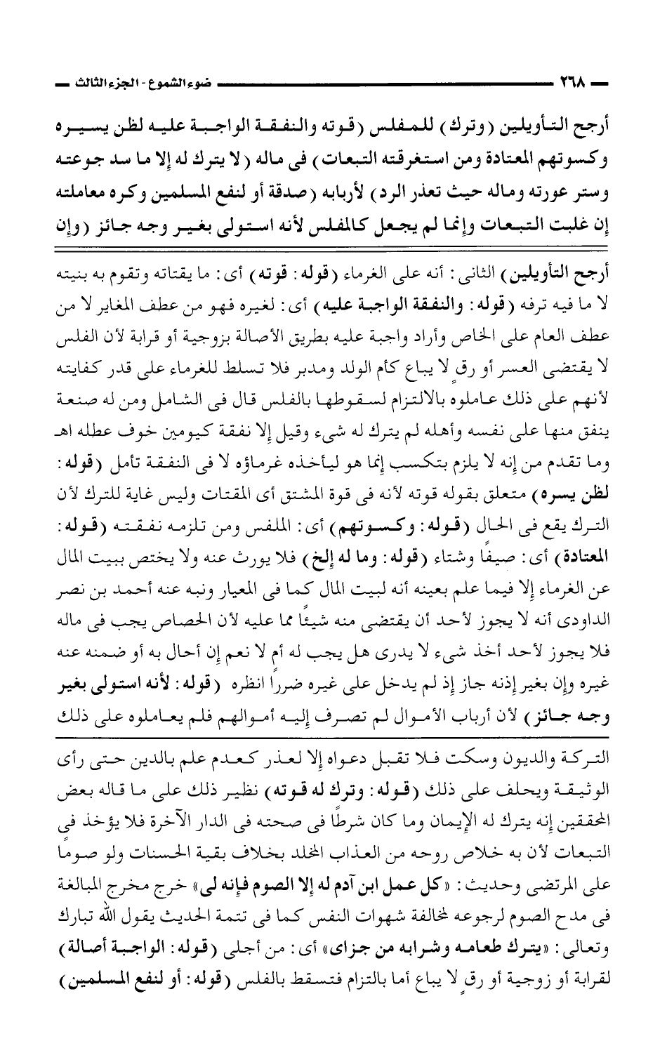 التركة والديون وسكت فلا تقبل دعواه إلا لعذر كعدم علم الدين حتى رأى الوثيقة ويحلف على ذلك (قوله: وترك له قوته) نظير ذلك على ما قاله بعض المحققين إنه يترك له الإيمان وما كان شرطًا فى صحته فى الدار الآخرة فلا يؤخذ فى التبعات لأن به خلاص روحه من العذاب المخلد بخلاف بقية الحسنات ولو صومًا على المرتضى وحديث: «كل عمل ابن آدم له إلا الصوم فإنه لى» خرج مخرج المبالغة فى مدح الصوم لرجوعه لمخالفة شهوات النفس كما فى تتمة الحديث يقول الله تبارك وتعالى: «يترك طعامه وشرابه من جَرَّاى» أى: من أجلى (قوله: الواجبة أصالة) لقرابة أو زوجية أو رقٍ لا يباع أما بالتزام فتسقط بالفلس (قوله: أو لنفع المسلمين)