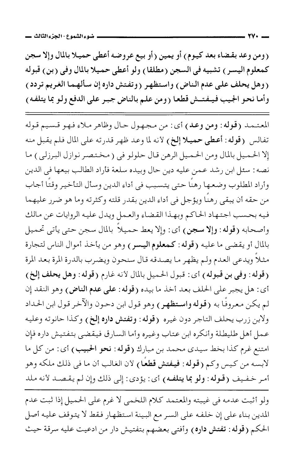 (ومن وعد بقضاء بعد كيوم) أو يمين (أو بيع عروضه أعطى حميلا بالمال وإلا سجن كمعلوم اليسر) تشبيه فى السجن (مطلقا) ولو أعطى حميلا بالمال وفى (بن) قبوله (وهل يحلف على عدم الناض) واستظهر (وتفتش داره إن سألهما الغريم تردد) وأما نحو الجيب فيفتش قطعا (ومن علم بالناض جبر على الدفع ولو بما يتلفه)