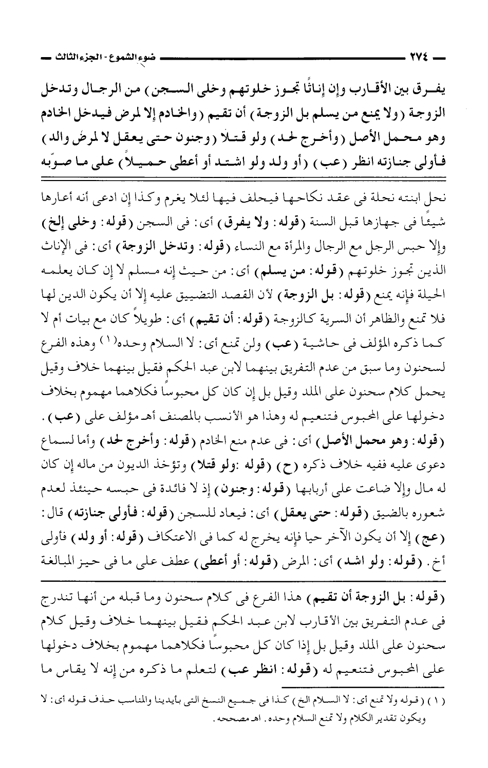 نحل ابنته نحلة فى عقد نكاحها فيحلف فيها لئلا يغرم وكذا إن ادعى أنه أعارها شيئًا فى جهازها قبل السنة (قوله: ولا يفرق) أى: فى السجن (قوله: وخلى إلخ) وإلا حبس الرجل مع الرجال والمرأة مع النساء (قوله: وتدخل الزوجة) أى: فى الإناث الذين تجوز خلوتهم (قوله: من يسلم) أى: من حيث إنه مسلم لا إن كان يعلمه الحيلة فإنه يمنع (قوله: بل الزوجة) لأن القصد التضييق عليه إلا أن يكون الدين لها فلا تمنع والظاهر أن السرية كالزوجة (قوله: أن تقيم) أى: طويلًا كان مع بيات أم لا كما ذكره المؤلف فى حاشية (عب) ولن تمنع أى: لا السلام وحده وهذه الفرع لسحنون وما سبق من عدم التفريق بينهما لابن عبد الحكم فقيل بينهما خلاف وقيل يحمل كلام سحنون على الملد وقيل بل إن كان كل محبوسًا فكلاهما مهموم بخلاف دخولهما على المحبوس فتنعيم له وهذا هو الأنسب بالمصنف أهـ مؤلف على (عب).