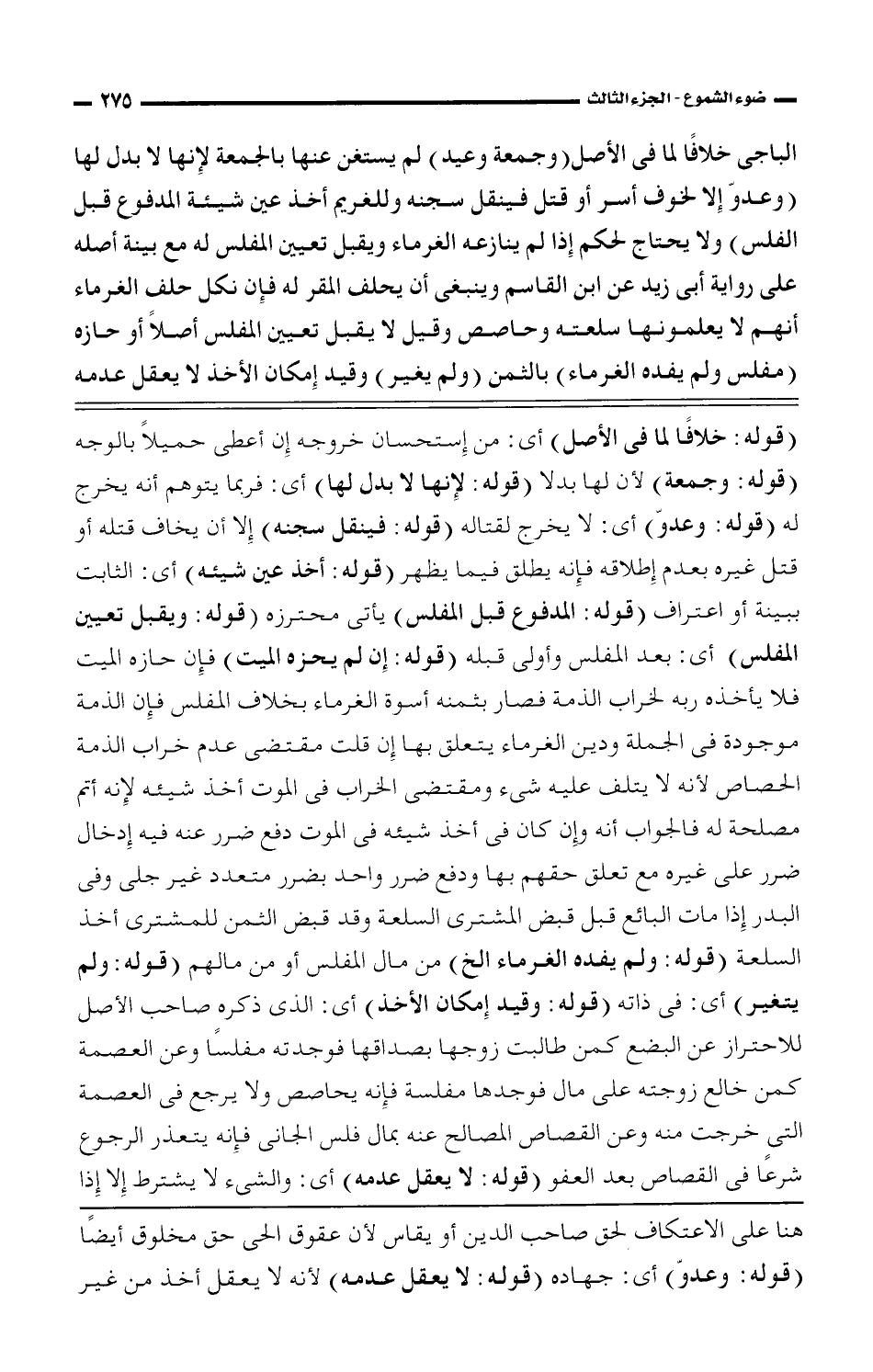 الباجى خلافًا لما فى الأصل (وجمعة وعيد) لم يستغن عنها بالجمعة لإنها لا بدل لها (وعدوّ إلا لخوف أسر أو قتل فينقل سجنه وللغريم أخذ عين شيئة المدفوع قبل الفلس) ولا يحتاج لحكم إذا لم ينازعه الغرماء ويقبل تعيين المفلس له مع بينة أصله على رواية أبى زيد عن ابن القاسم وينبغى أن يحلف المقر له فإن نكل حلف الغرماء أنهم لا يعملونها سلعه وحاصص وقيل لا يقبل تعيين المفلس أصلًا أوحازه (مفلس ولم يفده الغرماء) بالثمن (ولم يغير) وقيد إمكان الأخذ لا يعقل عدمه
