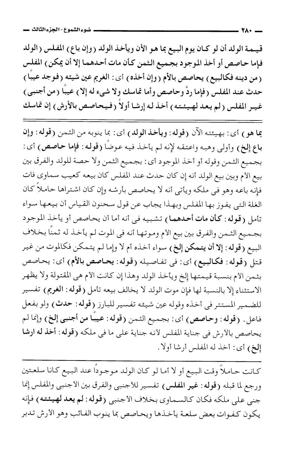 قيمة الولد أن لو كان يوم البيع بما هو الأن ويأخذ الولد (وإن باع) المفلس (الولد فإما حاصص أو أخذ الموجود بجميع الثمن كأن مات أحدهما إلا أن يمكن) المفلس (من دينه فكالبيع) يحاصص بالأم (وإن أخذه) أى: الغريم عين شيئه (فوجد عيبًا) حدث عند المفلس (فإما ردَّ وحاصص وأما تماسك ولا شئ له إلا) عيبًا (من أجنبى) غير المفلس (لم يعد لهيئته) أخذ له إرشا أولًا (فيحاصص بالأرش) إن تماسك