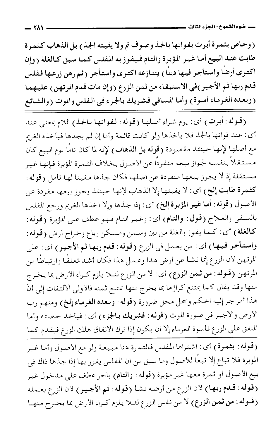 (قوله: أبرت) أى: يوم شراء أصلها (قوله: لفواتها بالجذ) اللام بمعنى عند أى: عند فواتها بالجذ فلا يأخذها ولو كانت قائمة وأما إن لم يجذها فيأخذه الغريم مع أصلها لإنها حينئذ مقصودة (قوله بل الذهاب) لإنه لما كان تاما يوم البيع كان مستقلًا بنفسه لجواز بيعه منفردًا عن الأصول بخلاف الثمرة المؤبرة فإنها غير مستقلة إذ لا يجوز بيعها منفردة عن أصلها فكان جذها مفيتا بها تأمل (قوله: كثمرة طابت إلخ) أى: لا يفيتها إلا الذهاب لإنها حينئذ يجوز بيعها مفردة عن الأصول (قوله: أما غير المؤبرة إلخ) أى: إذا جذها وإلا أخذها الغريم ورجع المفلس بالسقى والعلاج (قوله: والتام) أى: وغير التام فهو عطف على المؤبرة (قوله: كالغلة) أى: كما يفوز بالغلة من لبن وسمن ومسكن رباع وخراج أرض (قوله: واستأجر فيها) أى: من يعمل فى الزرع (قوله: قدم ربها ثم الأجير) أى: على المرتهن لأن الزرع إنما نشأ عن أرض هذا وعمل هذا فكانا أشد تعلقًا وارتباطًا من المرتهن (قوله: من ثمن الزرع) أى: لا من الزرع لئلا يلزم كراء الأرض بما يخرج منها وقد يقال كما يمتنع كراؤها بما يخرج منها يمتنع ثمنه فالأولى الالتفات إلى أنّ هذا أمر جر إليه الحكم والمحل محل ضرورة (قوله: وبعده الغرماء إلخ) ومنهم رب الأرض والأجير فى صورة الموت (قوله: فشريك بالجزء) أى: فيأخذ حصته وأما المنفق على الزرع فأسوة الغرماء إلا أن يكون إذا ترك الانفاق هلك الزرع فيقدم كما