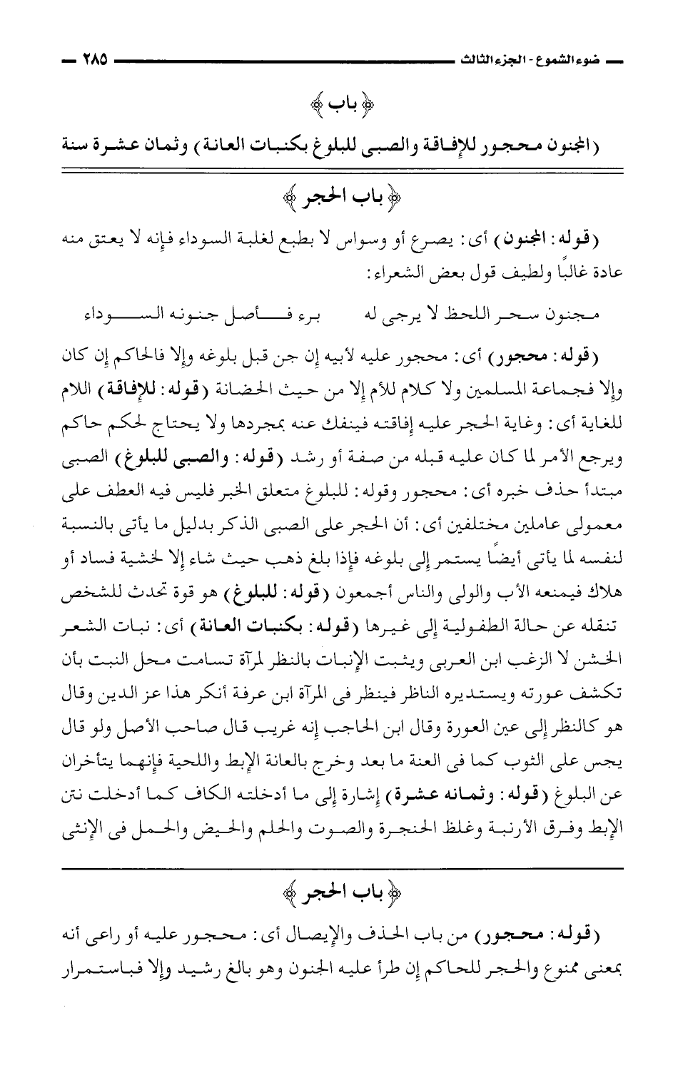 (المجنون محجور للإفاقة والصبى للبلوغ بكنبات العانة) وثمان عشرة سنة