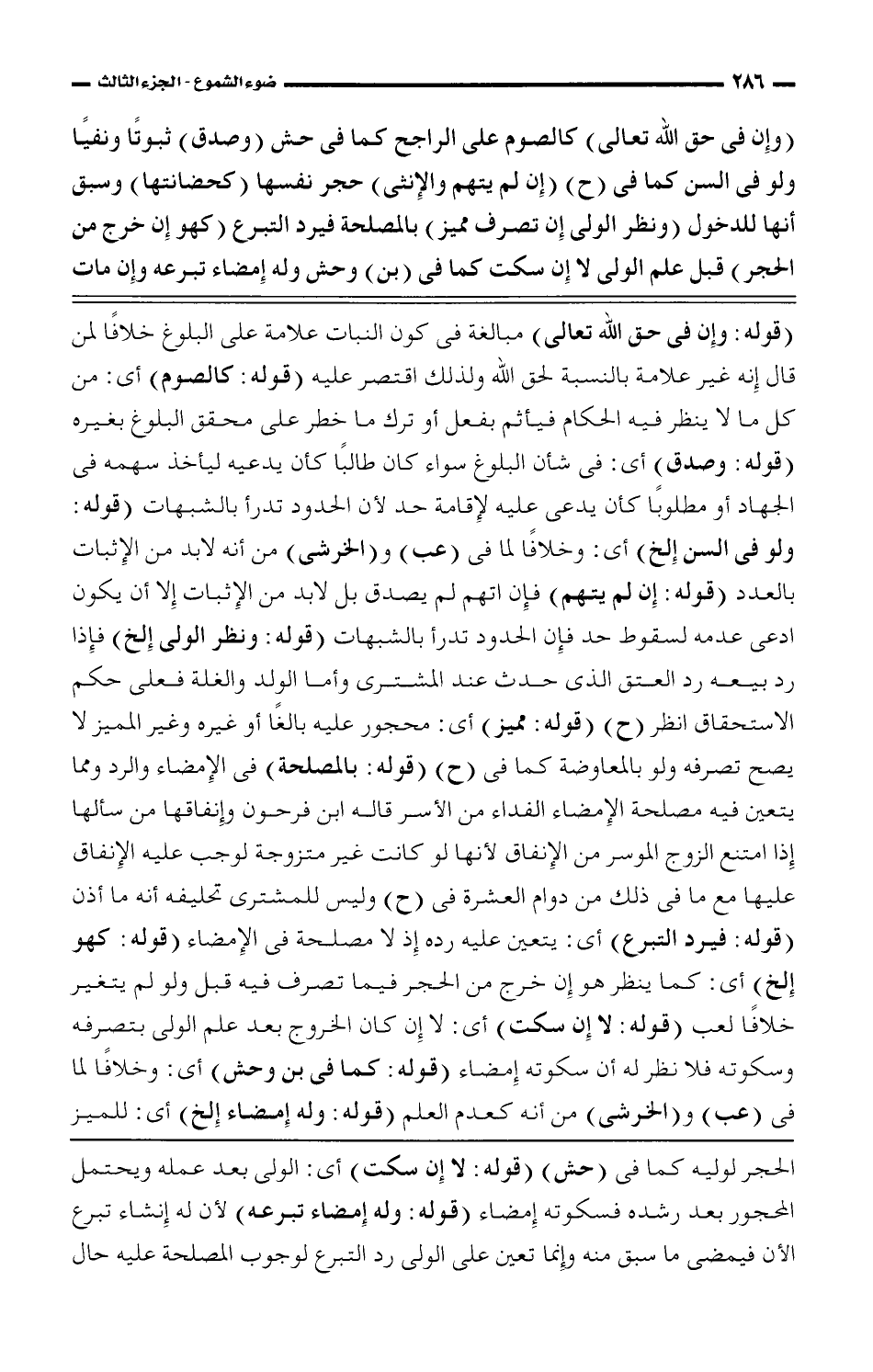 (قوله: وإن فى حق الله تعالى) مبالغة فى كون النبات علامة على البلوغ خلافًا لمن قال إنه غير علامة بالنسبة لحق الله ولذلك اقتصر عليه (قوله: كالصوم) أى: من كل ما لا ينظر فيه الحكام فيأثم بفعل أو ترك ما خطر على محقق البلوغ بغيره (قوله: وصدق) أى: فى شأن البلوغ سواء كان طالبًا كأن يدعيه ليأخذ سهمه فى الجهاد أو مطلوبًا كأن يدعى عليه لإقامة حد لأن الحدود تدرأ بالشبهات (قوله: ولو فى السن إلخ) أى: وخلافًا لما فى (عب) و (الخرشى) من أنه لابد من الإثبات بالعدد (قوله: إن لم يتهم) فإن اتهم لم يصدق بل لابد من الإثبات إلا أن يكون ادعى عدمه لسقوط حد فإن الحدود تدرأ بالشبهات (قوله: ونظر الولى إلخ) فإذا رد بيعه رد العتق الذى حدث عند المشترى وأما الولد والغلة فعلى حكم الاستحقاق انظر (ح) (قوله: مميز) أى: محجور عليه بالغًا أو غيره وغير المميز لا يصح تصرفه ولو بالمعاوضة كما فى (ح) (قوله: بالمصلحة) فى الإمضاء والرد ومما يتعين فيه مصلحة الإمضاء الفداء من الأسر قاله ابن فرحون وإنفاقها من سألها إذا امتنع الزوج الموسر من الإنفاق لأنها لو كانت غير متزوجة لوجب عليه الإنفاق عليها مع ما فى ذلك من دوام العشرة فى (ح) وليس للمشترى تحليفه أنه ما أذن (قوله: فيرد التبرع) أى: يتعين عليه رده إذ لا مصلحة فى الإمضاء (قوله: كهو إلخ) أى: كما ينظر هو إن خرج من الحجر فيما تصرف فيه قبل ولو لم يتغير خلافًا لـ (عب) (قوله: لا إن سكت) أى: لا إن كان الخروج بعد علم الولى بتصرفه وسكوته فلا نظر له أن سكوته إمضاء (قوله: كما فى بن وحش) أى: وخلافًا لما فى (عب) و (الخرشى) من أنه كعدم العلم (قوله: وله إمضاء إلخ) أى: للميز
