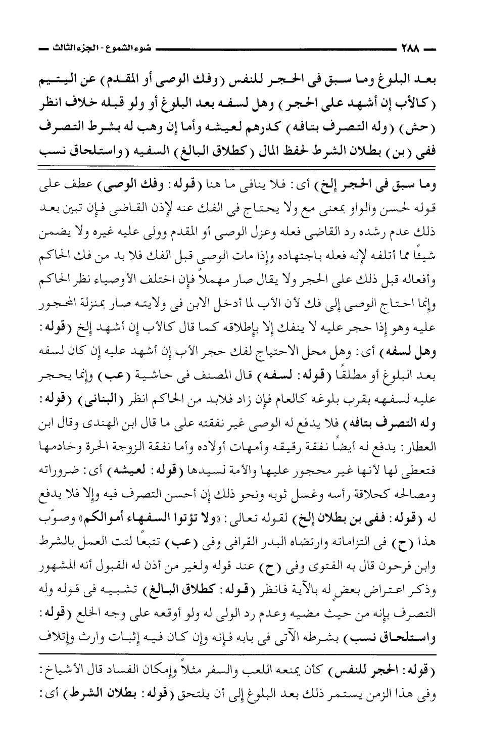 (قوله: الحجر للنفس) كأن يمنعه اللعب والسفر مثلًا وإمكان الفساد قال الأشياخ: وفى هذا الزمن يستمر ذلك بعد البلوغ إلى أن يلتحق (قوله: بطلان الشرط) أى:
