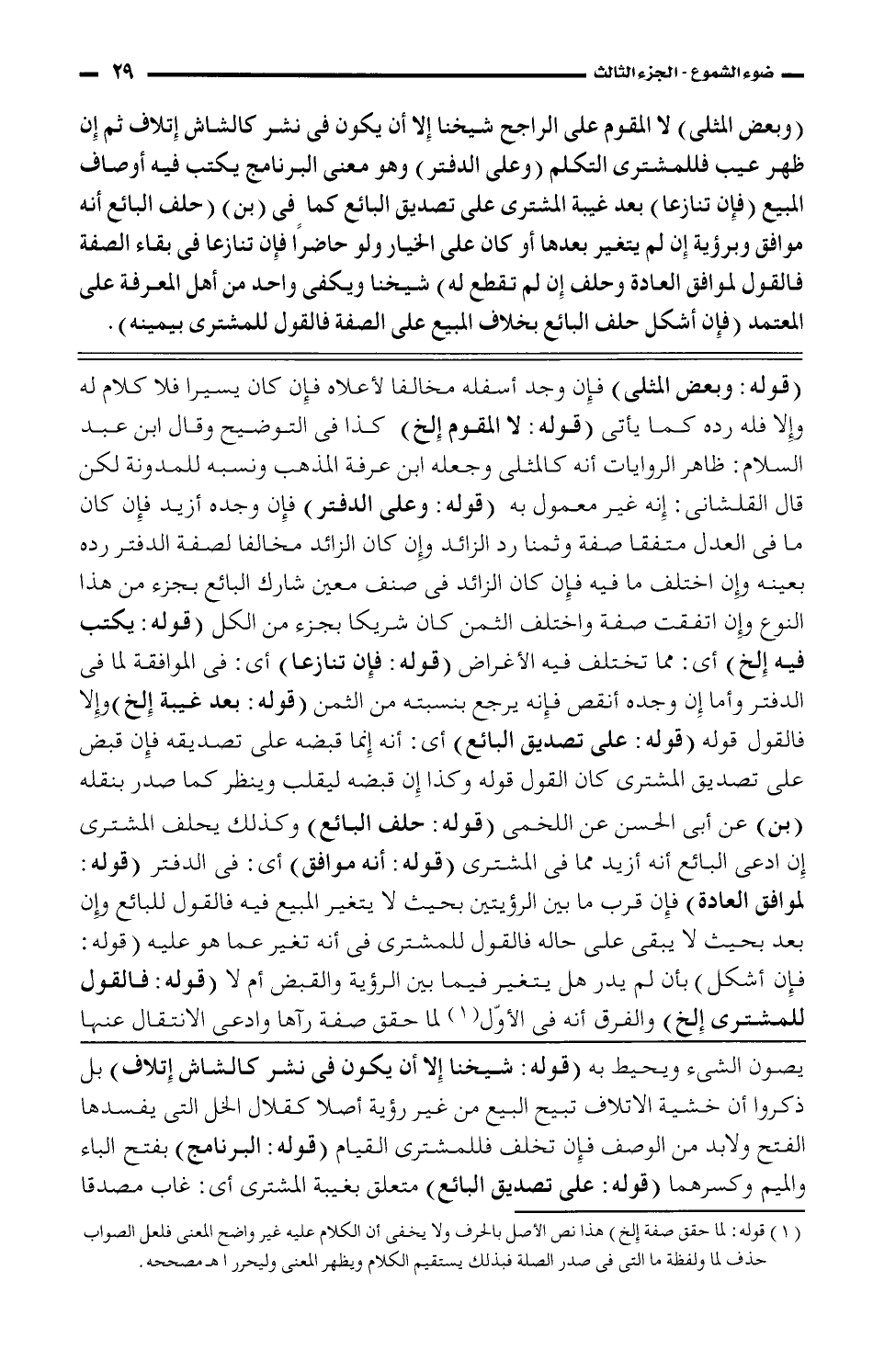 (وبعض المثلى) لا المقوم على الراجح شيخنا إلا أن يكون فى نشر كالشاش إتلاف ثم إن ظهر عيب فللمشترى التكلم (وعلى الدفتر) وهو معنى البرنامج يكتب فيه أوصاف المبيع (فإن تنازعا) بعد غيبة المشترى على تصديق البائع كما فى (بن) (حلف البائع أنه موافق وبرؤية إن لم يتغير بعدها أو كان على الخيار ولو حاضرًا فإن تنازعا فى بقاء الصفة فالقول لموافق العادة وحلف إن لم تقطع له) شيخنا ويكفى واحد من أهل المعرفة على المعتمد (فإن أشكل حلف البائع بخلاف المبيع على الصفة فالقول للمشترى بيمينه).
