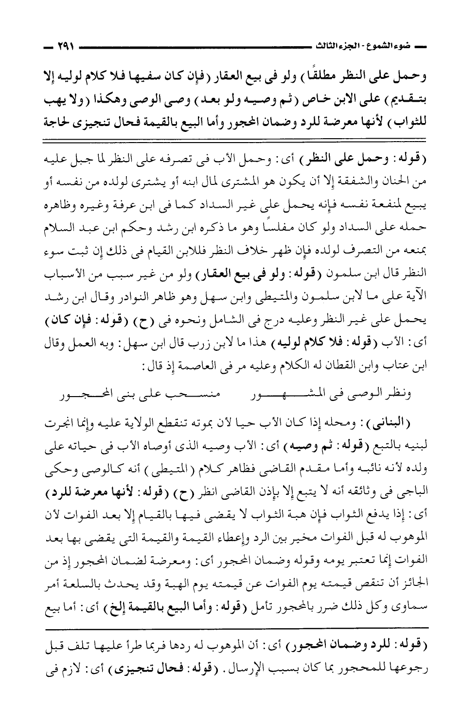 وحمل على النظر مطلقًا) ولو فى بيع العقار (فإن كان سفيها فلا كلام لوليه إلا بتقديم) على الابن خاص (ثم وصيه ولو بعد) وصى الوصى وهكذا (ولا يهب للثواب) لأنها معرضة للرد وضمان المحجور وأما البيع بالقيمة فحال تنجيزى لحاجة