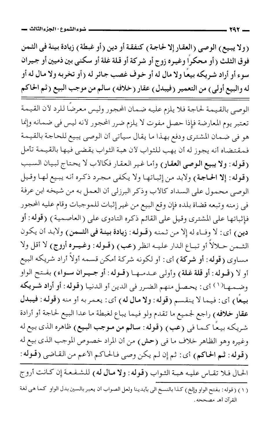 (ولا يبيع) الوصى (العقار إلا لحاجة) كنفقة أو دين (أو عبطة) زيادة بينة فى الثمن فوق الثلث (أو محكرًا وغيره زوج أو شركة أو قلة غلة أو سكنى بين ذميين أو جيران سوء أو أراد شريكه بيعًا ولا مال له أو خوف غصب جائر له (أو تخربه ولا مال له أو له والبيع أولى) من التعمير (فيبدل) عقار (خلافه) سالم من موجب البيع (ثم الحاكم
