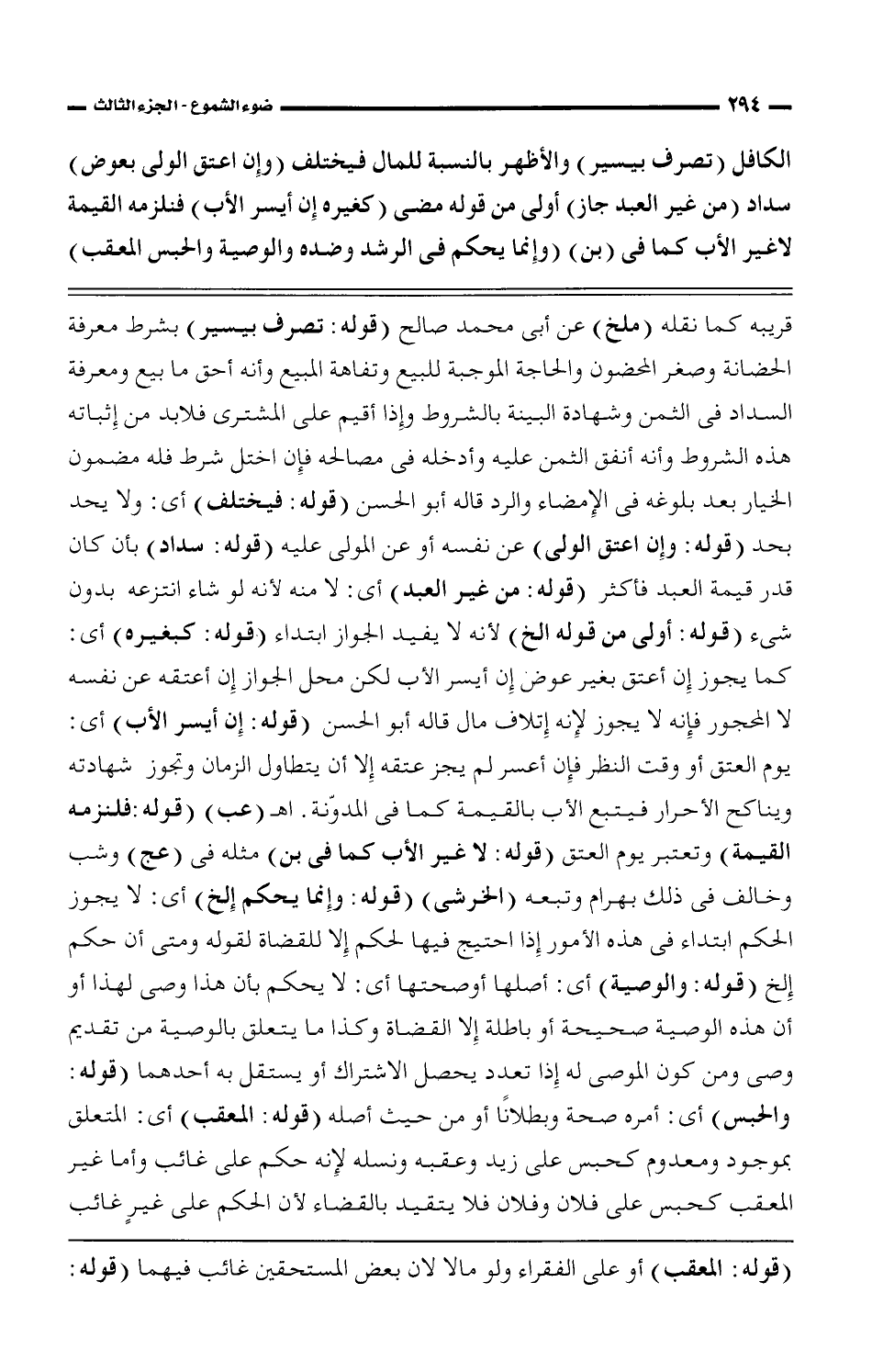 الكافل (تصرف بيسير) والأظهر بالنسبة للمال فيختلف (وإن اعتق الولى بعوض) سداد (من غير العبد جاز) أولى من قوله مضى (كغيره إن أيسر الأب) فنلزمه القيمة لا غير الأب كما فى (بن) (وإنما يحكم فى الرشد وضده والوصية والحبس المعقب)