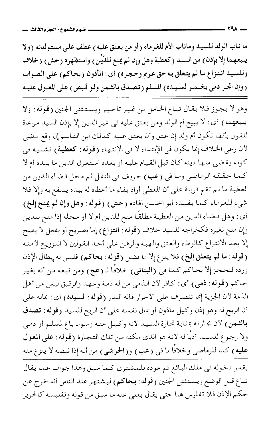 ما ناب الولد للسيد وما ناب الأم للغرماء (أو من يعتق عليه) عطف على مستولدته (ولا يبيعهما إلا بإذن) من السيد (كعطية وهل وإن لم يمنع للدَّيْن* واستظهره (حش) (خلاف وللسيد انتزاع ما لم يتعلق به حق غريم وحجره) أى: المأذون (بحاكم) على الصواب (وإن اتجر ذمى بخمر لسيده) المسلم (تصدق بالثمن ولو قبض) على المعول عليه