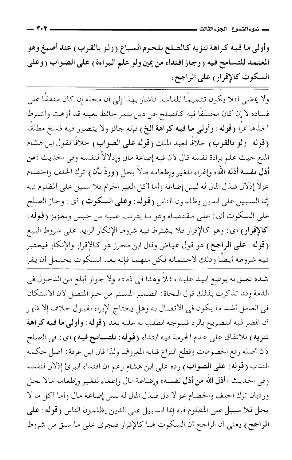 شدة تعلق به بوضع اليد عليه مثلًا وهذا فى ذمته ولا جواز أبلغ من الدخول فى الذمة وقد تذكرت بذلك قول النحاة: الضمير المستتر من حيز المتصل لأن الاستكان فى العامل أشد ما يكون فى الاتصال به وهل يحتاج الإبراء لقبول خلاف إلا ظهر أن المضر فيه التصريح بالرد فيتوجه الطلب به عليه بعد (قوله: وأولى ما فيه كراهة تنزيه) للاتفاق على عدم الحرمة فيه ابتداء (قوله: للتسامح فيه) أى: فى الصلح لأن أصله رفع الخصومات وقطع النزاع فبابه المعروف ولذا قال ابن عرفة: أصل حكمه الندب (قوله: على الصواب) رده على ابن هشام زعم أن افتداء البرئ إذلال لنفسه وفى الحديث «أذل الله من أذل نفسه» وإضاعة مال وإطغاء للغير وإطعامه مالا يحل وردبان ترك الحلف والخصام عز لا ذل فبذل المال له ليس إضاعة مال وأما أكل ما لا يحل فلا سبيل على المظلوم فيه إنما السبيل على الذين يظلمون الناس (قوله: على الراجح) يعنى أن الراجح أن السكوت هنا كالإقرار فيجرى على ما سبق من شروط