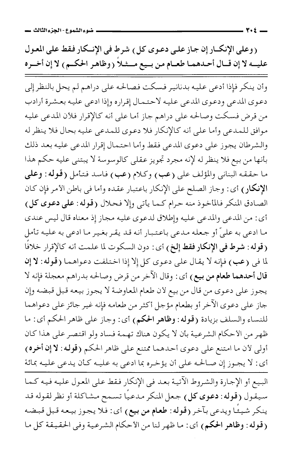 البيع أو الإجارة والشروط الآتية بعد فى الإنكار فقط على المعول عليه فيه كما سيقول (قوله: دعوى كل) جعل المنكر مدعيًا مشاكلة أو نظر لقوله قد ينكر شيئًا ويدعى بآخر (قوله: طعام من بيع) أى: فلا يجوز بيعه قبل قبضه (قوله: وظاهر الحكم) أى: ما ظهر لنا من الأحكام الشرعية وفى الحقيقة كل ما
