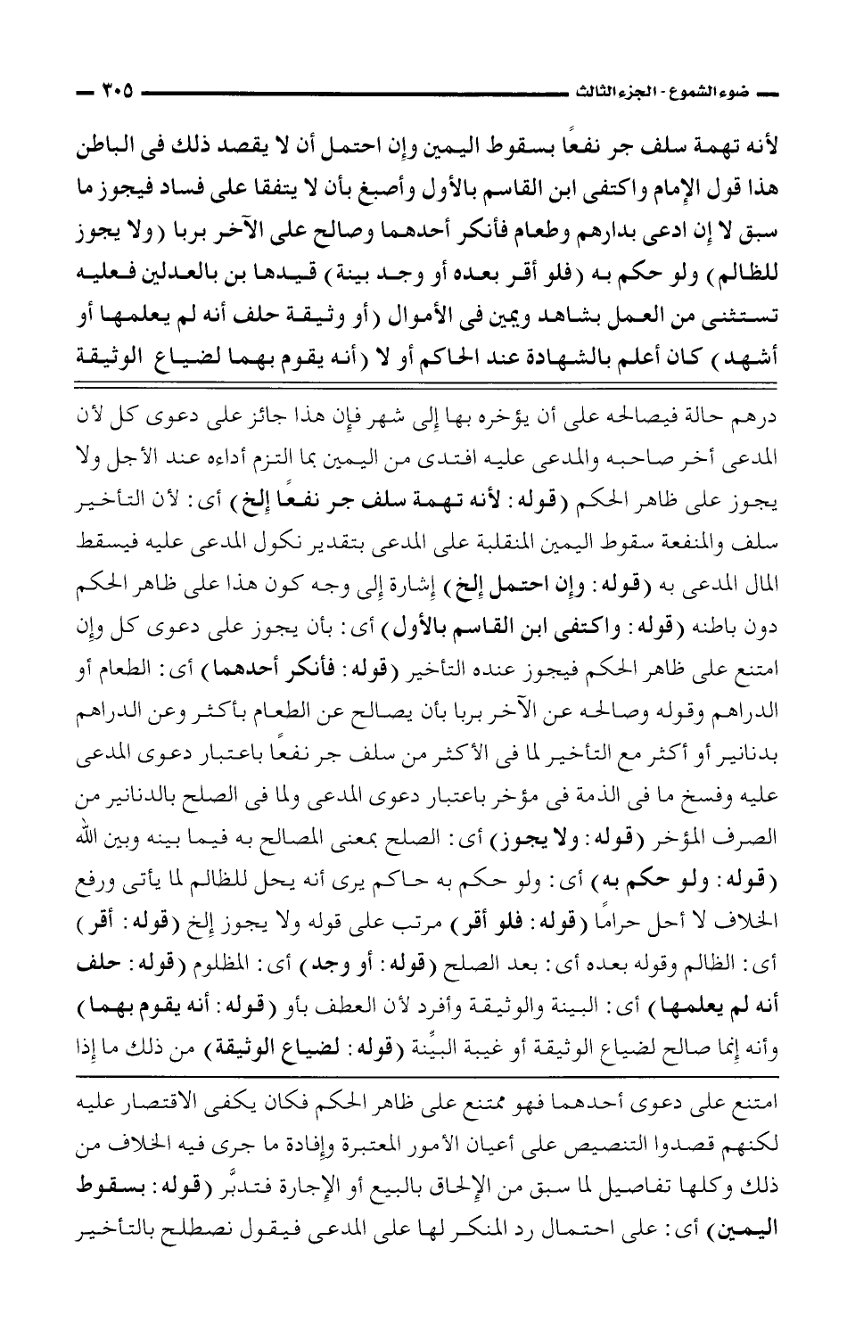 لأنه تهمة سلف جر نفعًا بسقوط اليمين وإن احتمل أن لا يقصد ذلك فى الباطن هذا قول الإمام واكتفى ابن القاسم بالأول وأصبغ بأن لا يتفقا على فساد فيجوز ما سبق لا إن ادعى بدراهم وطعام فأنكر أحدهم وصالح على الآخر بربا (ولا يجوز للظالم) ولو حكم به (فلو أقر بعده أو وجد بينة) قيدها بن بالعدلين فعليه تستثنى من العمل بشاهد ويمين فى الأموال (أو وثيقة حلف أنه لم يعلمها أو أشهد) كان أعلم بالشهادة عند الحاكم أو لا (أنه يقوم بهما لضياع الوثيقة