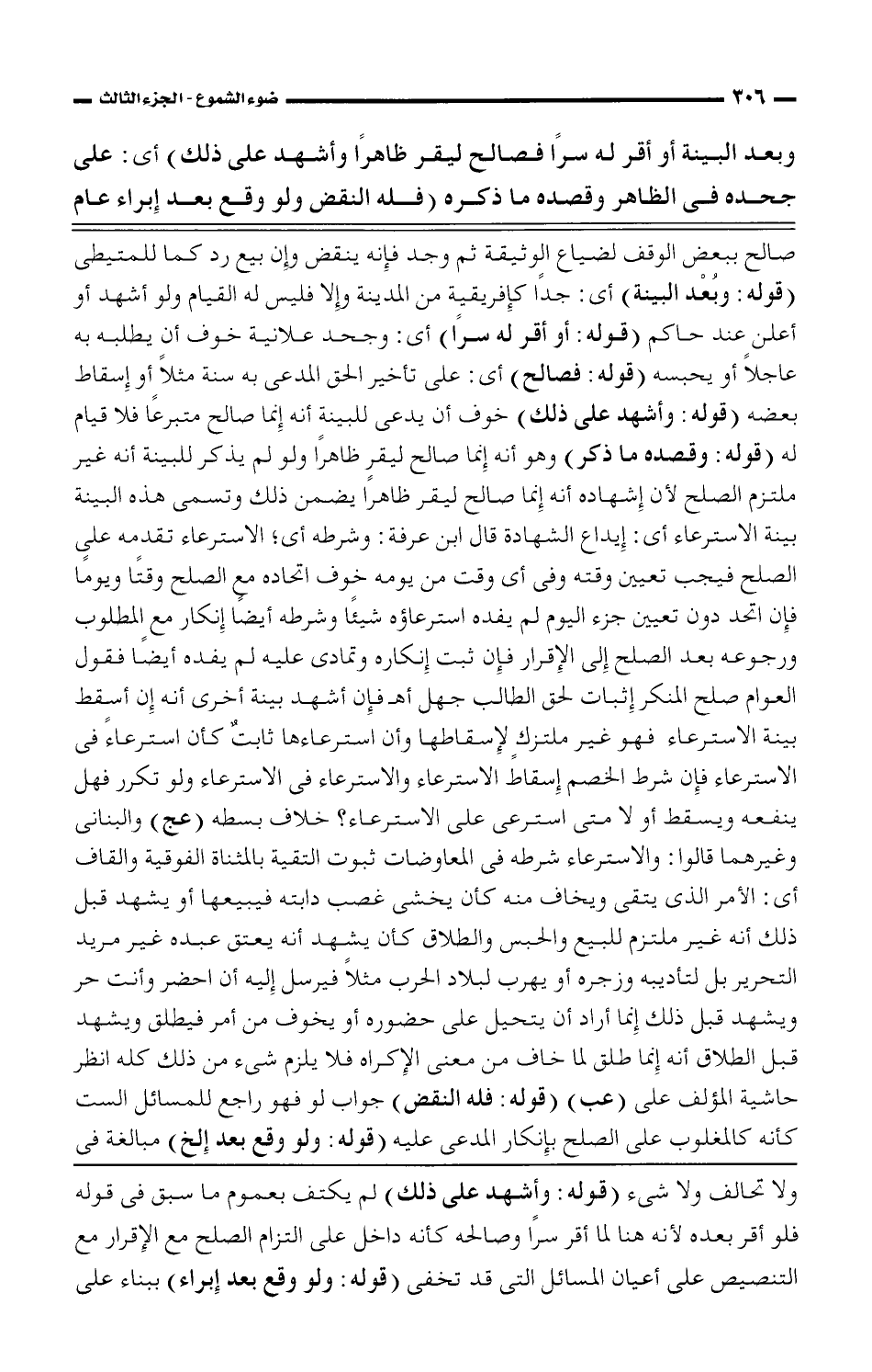 صالح ببعض الوقف لضياع الوثيقة ثم وجد فإنه يقنض وإن بيع رد كما للمتيطى (قوله: وبُعْد البينة) أى: جدًا كإفريقية من المدينة وإلا فليس له القيام ولو أشهد أو أعلن عند حاكم (قوله: أو أقر له سرًا) أى: وجحد علانية خوف أن يطلبه به عاجلًا أو يحبسه (قوله: فصالح) أى: على تأخير الحق المدعى به سنة مثلًا أو إسقاط بعضه (قوله: وأشهد على ذلك) أى: على تأخير الحق المدعى به سنة مثلًا أو إسقاط بعضه (قوله: وأشهد على ذلك) خوف أن يدعى للبينة أنه إنما صالح متبرعًا فلا قيام له (قوله: وقصده ما ذكر) وهو أنه إنما صالح ليقر ظاهرًا ولو لم يذكر للبينة أنه غير ملتزم الصلح لأن إشهاده أنه إنما صالح ليقر ظاهرًا يضمن ذلك وتسمى هذه البينة بينة الاسترعاء أى: إيداع الشهادة قال ابن عرفة: وشرطه أى؛ الاسترعاء تقدمه على الصلح فيجب تعيين وقته وفى أى وقت من يومه خوف اتحاده مع الصلح وقتًا ويومًا فإن اتحد دون تعيين جزء اليوم لم يفده استرعاؤه شيئًا وشرطه أيضًا إنكار مع الملطلوب ورجوعه بعد الصلح إلى الإقرار فإن ثبت إنكاره وتمادى عليه لم يفده أيضًا فقول العوام صلح المنكر إثبات لحق الطالب جهل أهـ فإن أشهد بينة أخرى أنه إن أسقط بينة الاسترعاء فهو غير ملتزكٍ لإسقاطها وأن استرعاءها ثابتٌ كأن استرعاءً فى الاسترعاء فإن شرط الخصم إسقاط الاسترعاء والاسترعاء فى الاسترعاء ولو تكرر فهل ينفعه ويسقط أو لا متى اسرتعى على الاسترعاء؟ خلاف بسطه (عج) والبنانى وغيرهما قالوا: والاسترعاء شرطه فى المعاوضات ثبوت الالتقية بالمثناة الفوقية والقاف أى: الأمر الذى يتقى ويخاف منه كأن يخشى غصب دابته فيبيعها أو يشهد قبل ذلك أنه غير ملتزم للبيع والحبس والطلاق كأن يشهد أنه يعتق عبده غير مريد التحرير بل لتأدبيه وزجره أو يهرب لبلاد الحرب مثلًا فيرسل إليه أن احضر وأنت حر ويشهد قبل ذلك إنما أراد أن يتحيل على حضوره أو يخوف من أمر فيطلق ويشهد قبل الطلاق أنه إنما طلق لما خاف من معنى الإكراه فلا يلزم شئ من ذلك كله انظر حاشية المؤلف على (عب) (قوله: فله النقض) جواب لو فهم راجع للمسائل الست كأنه كالمغلوب على الصلح بإنكار المدعى عليه (قوله: ولو وقع بعد إلخ) مبالغة فى