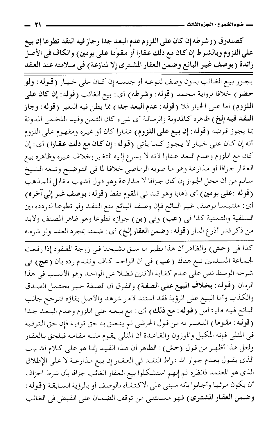 كصندوق (وشرطه إن كان على اللزوم عدم البعد جدا وجاز فيه النقد تطوعا إن بيع على اللزوم وبالشرط إن كان مع ذلك عقارا أو مقوّما على يومين) والكاف فى الأصل زائدة (بوصف غير البائع وضمن العقار المشترى إلا لمنازعة) فى سلامته عند العقد