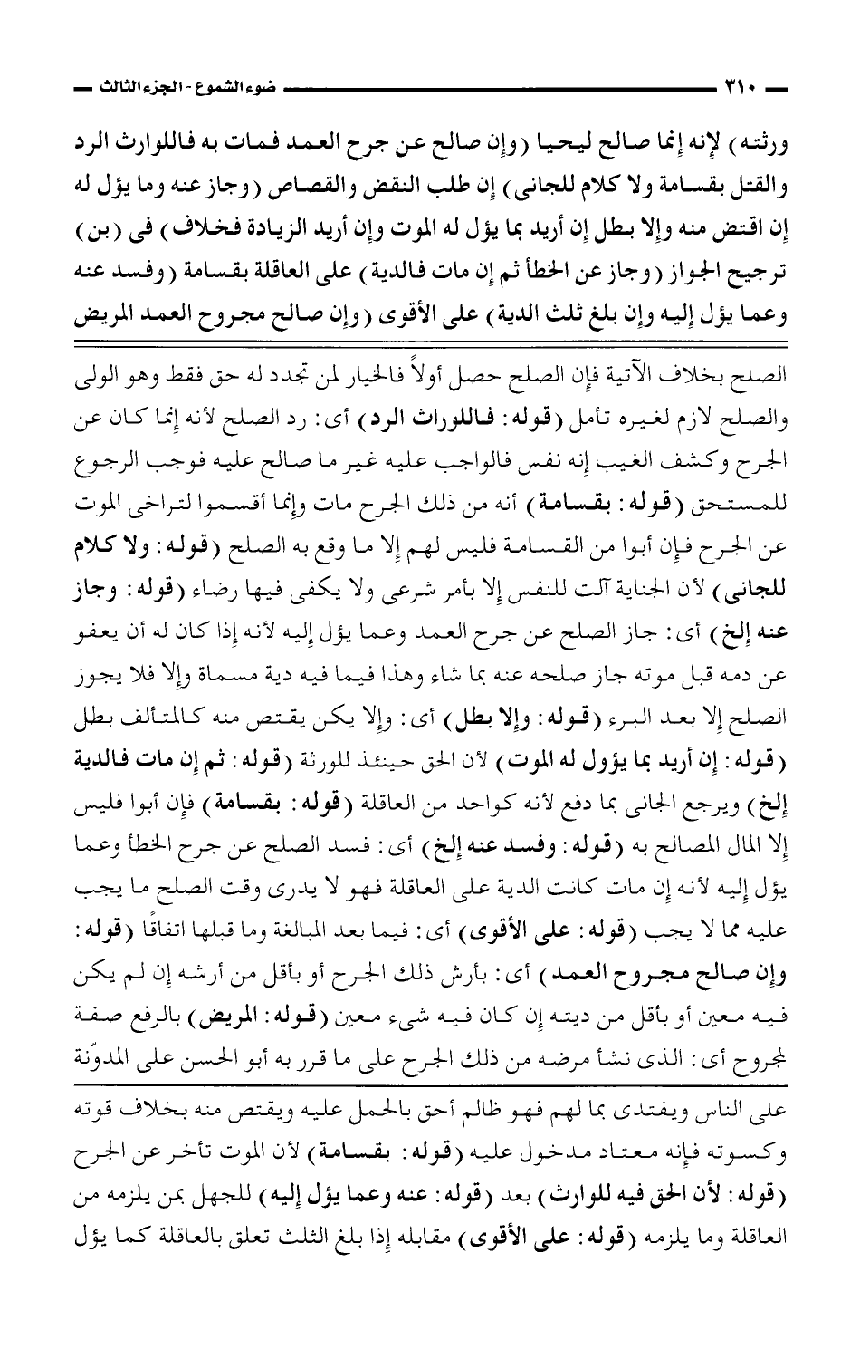 الصلح بخلاف الآتية فإن الصلح حصل أولًا فالخيار لمن تجدد له حق فقط وهو الولى والصلح لازم لغيره تأمل (قوله: فاللوارث الرد) أى: رد الصلح لأنه إنما كان عن الجرح وكشف الغيب إنه نفس فالواجب عليه غير ما صالح عليه فوجب الرجوع للمستحق (قوله: بقسامة) أنه من ذلك الجرح مات وإنما أقسموا لتراخى الموت عن الجرح فإن أبوا من القسامة فليس لهم إلا ما وقع به الصلح (قوله: ولا كلام للجانى) لأن الجناية آلت للنفس إلا بأمر شرعى ولا يكفى فيها رضاء (قوله: وجاز عنه إلخ) أى: جاز الصلح عن جرح العمد وعما يؤل إليه لأنه إذا كان له أن يعفو عن دمه قبل موته جاز صلحه عنه بما شاء وهذا فيما فيه دبة مسماة وإلا فلا يجوز الصلح إلا بعد البراء (قوله: وإلا بطل) أى: وإلا يكن يقتض منه كالمتألف بطل (قوله: إن أريد بما يؤول له الموت) لأن الحق حينئذ للورثة (قوله: ثم إن مات فالدية إلخ) ويرجى الجانى بما دفع لأنه كواحد من العاقلة (قوله: بقسامة) فإن أبوا فليس إلا المال المصالح به (قوله: وفسد عنه إلخ) أى: فسد الصلح عن جرح الخطأ وعما يؤل إليه لأنه إن مات كانت الدية على العاقلة فهو لا يدرى وقت الصلح ما يجب عليه مما لا يجب (قوله: على الأقوى) أى: لإيما بعد المبالغة وما قبلها اتفاقًا (قوله: وإن صالح مجروح العمد) أى: بأرش ذلك الجرح أو بأقل من أرشه إن لم يكن فيه معين أو بأقل من ديته إن كان فيه شئ معين (قوله: المريض) بالرفع صفة لمجروح أى: الذى نشأ مرضه من ذلك الجرح على ما قرر به ألو الحسن على المدوّنة