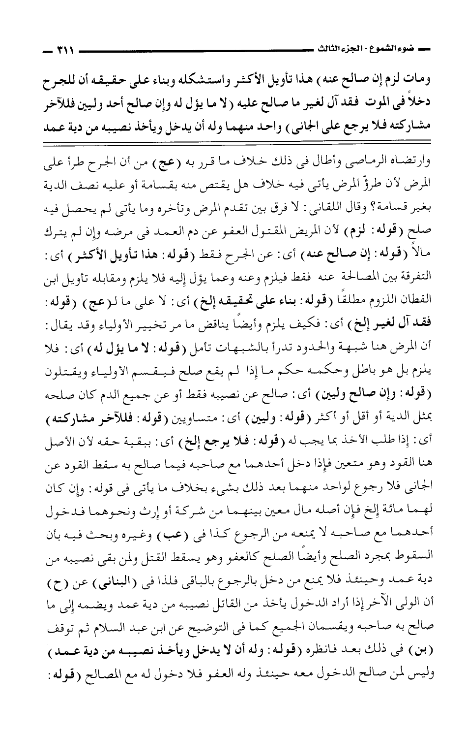 ومات لزم إن صالح عنه) هذا تأويل الأكثر واستشكله وبناء على حقيقه أن للجرج دخلًا فى الموت فقد آل لغير ما صلح عليه (لا ما يؤل له وإن صالح أحد وليين فللآخر مشاركته فلا يرجع إلى الجانى) واحد منهما وله أن يدخل ويأخذ نصيبه من دية عمد