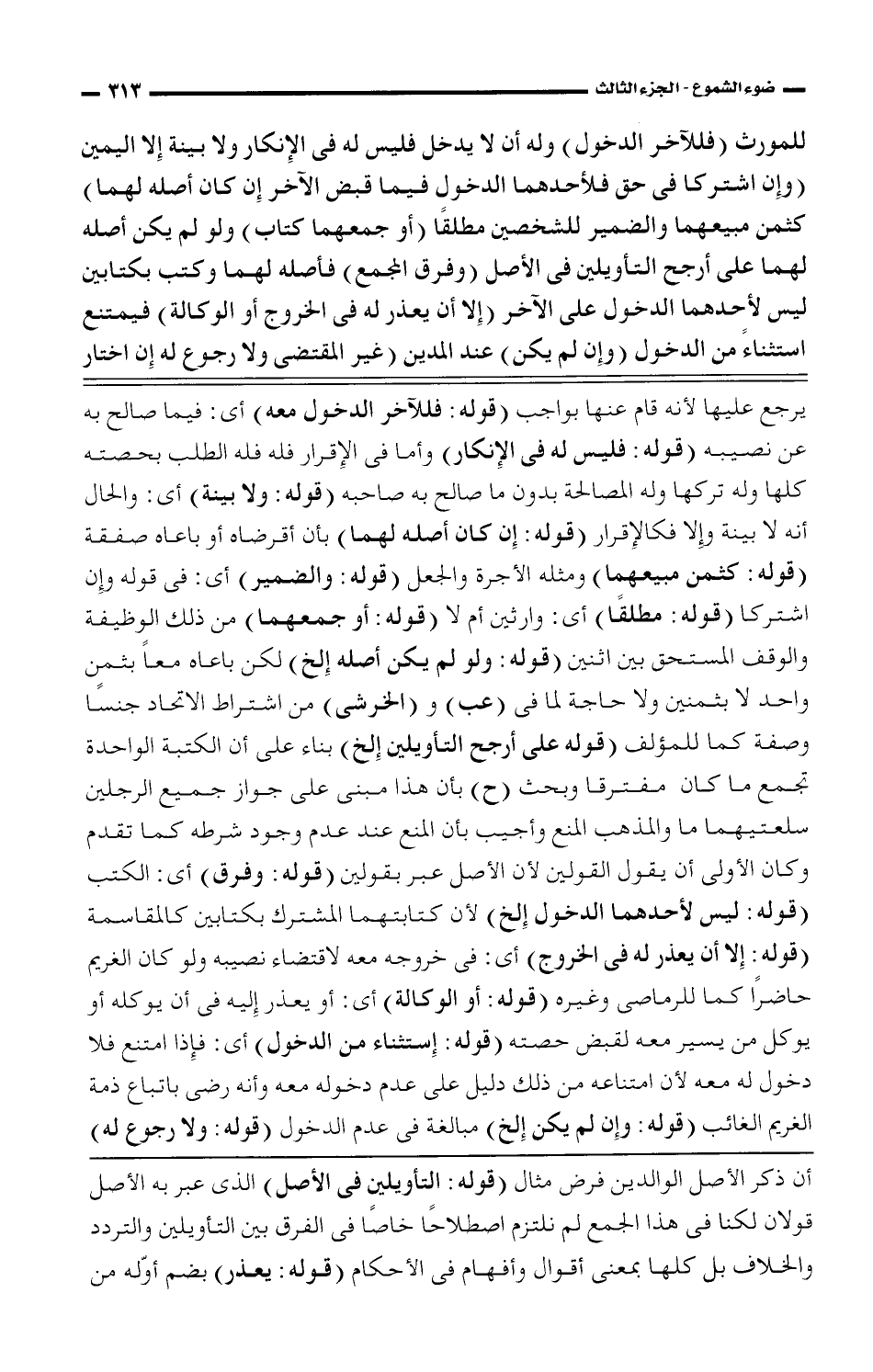 للمورث (فللآخر الدخول) وله أن لا يدخل فليس له فى الإنكار ولا بينة إلا اليمين (وإن اشتركا فى حق فلأحدهما الدخول فيما قبض الآخر إن كان أصله لهما) كثمن مبيعهما والضمير للشخصين مطلقًا (أو جمعهما كتاب) ولو لم يكن أصله لهما على أرجح التأويلين فى الأصل (وفرق المجمع) فأصله لهما وكتب بكتابين ليس لأحدهما الدخول على الآخر (إلا أن يعذر له فى الخروج أو الوكالة) فيمتنع استنثاءً من الدخول (وإن لم يكن) عند المدين (غير المقتضى ولا رجوع له إن اختار