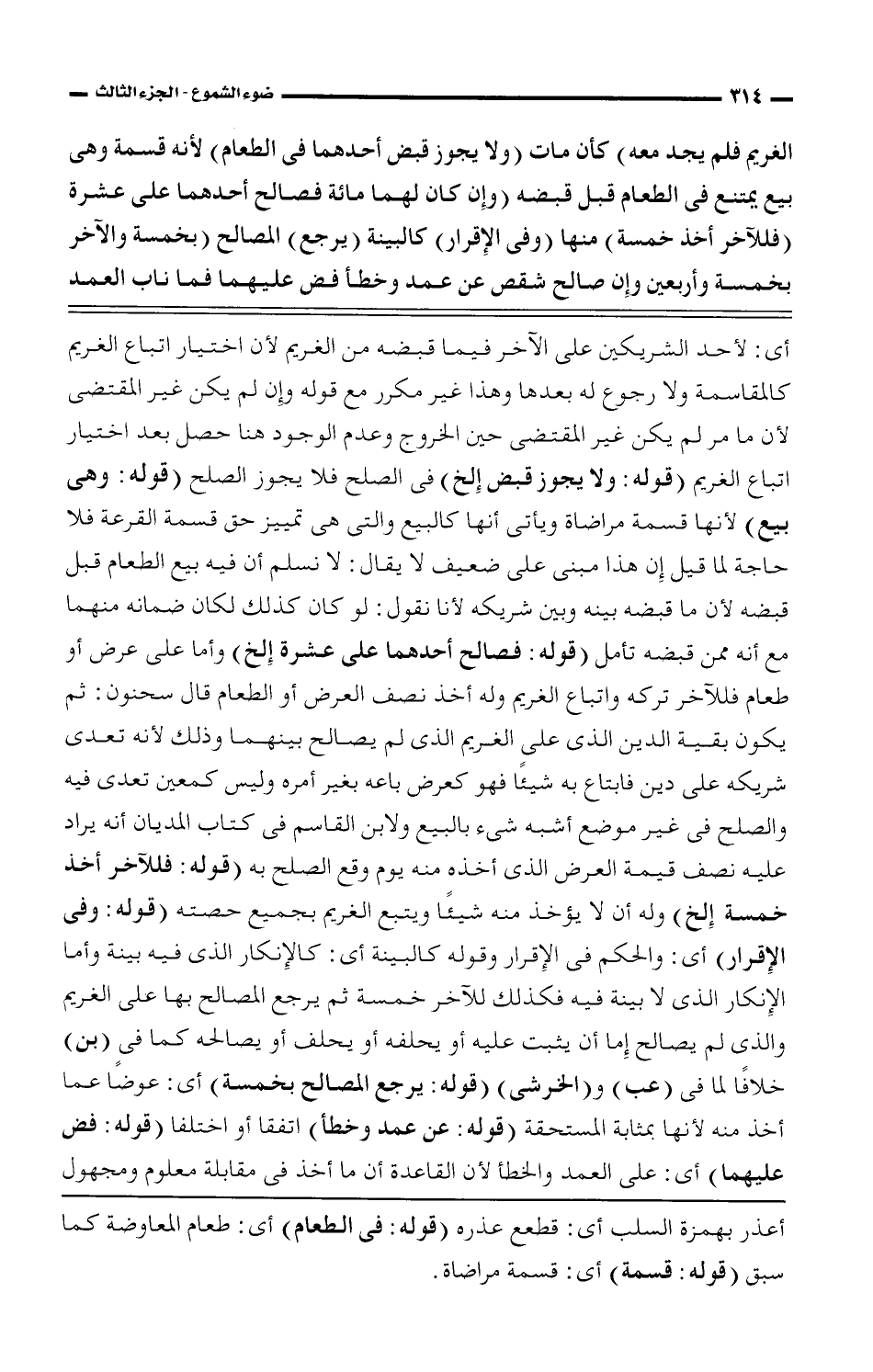 الغريم فلم يجد معه) كأن مات (ولا يجوز قبض أحدهما فى الطعام) لأنه قسمة وهى بيع يمتنع فى الطعام قبل قبضه (وإن كان لهما مائة فصالح أحدهما على عشرة (فللآخر أخذ خسمة) منها (وفى الإقرار) كالبينة (يرجع) المصالح (بخمسة والآخر بخمسة وأربعين وإن صالح شقص عن عمد وخطأ فض عليهما فما ناب العمد