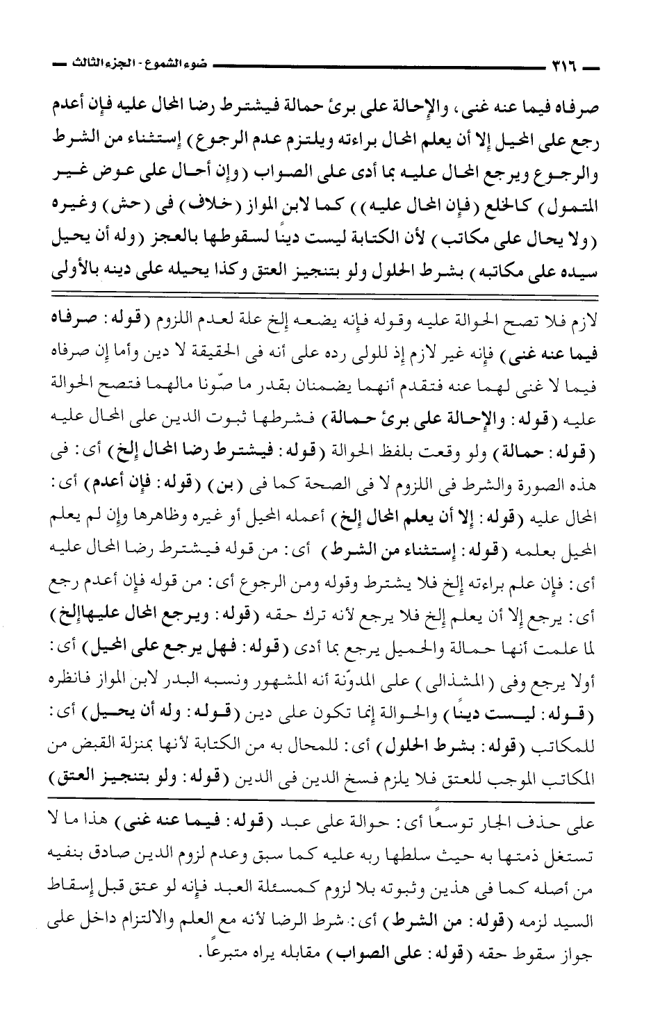 صرفاه فيما عنه غنى, والإحالة على برئ حمالة فيشترط رضا المحال عليه فإن أعدم رجع على المحيل إلا أن يعلم المحال براءته ويلتزم عدم الرجوع) استثناء من الشرط والرجوع ويرجع المحال عليه بما أدى على الصواب (وإن أحال على عوض غير المتمول) كالخلع (فإن المحال عليه) كما لابن المواز (خلاف) فى (حش) وغيره (ولا يحال على مكاتب) لأن الكتابة ليست دينًا لسقوطها بالعجز (وله أن يحيل سيده على مكاتبه) بشرط الحلول ولو بتنجيز العتق وكذا يحيله على دينه بالأولى