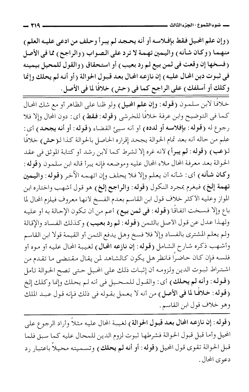(وإن علم المحيل فقط بإفلاسه أو أنه يحجد لم يبرأ وحلف من ادعى عليه العلم) منهما (وكان شأنه) وليمين تهمة لا ترد على الصواب (والراجح) مما فى الأصل (فسخها إن وقعت فى ثمن بيع ثم رد بعيب) أو استحقاق (والقول للمحيل بيمينه فى ثبوت دين المحال عليه) إن نازعه المحال بعد قبول الحوالة (أو أنه لم يحلك وإنما وكلك أو أسلفك) على الراجح كما فى (حش) خلافًا لما فى الأصل.