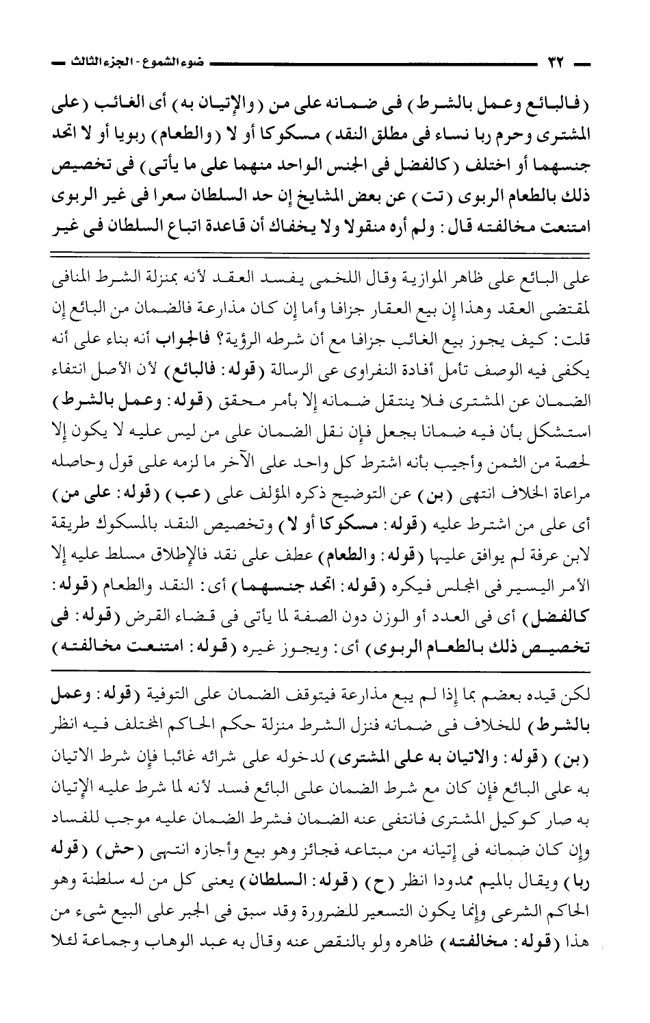 (فالبائع وعمل بالشرط) فى ضمانه على من (والإتيان به) أى الغائب (على المشترى وحرم ربا نساء فى مطلق النقد) مسكوكا أو لا (والطعام) ربويا أو لا اتحد جنسهما أو اختلف (كالفضل فى الجنس الواحد منهما على ما يأتى) فى تخصيص ذلك بالطعام الربوى (تت) عن بعض المشايخ إن حد السلطان سعرًا فى غير الربوى امتنعت مخالفته قال: ولم أره منقولا ولا يخفاك أن قاعدة اتباع السلطان فى غير