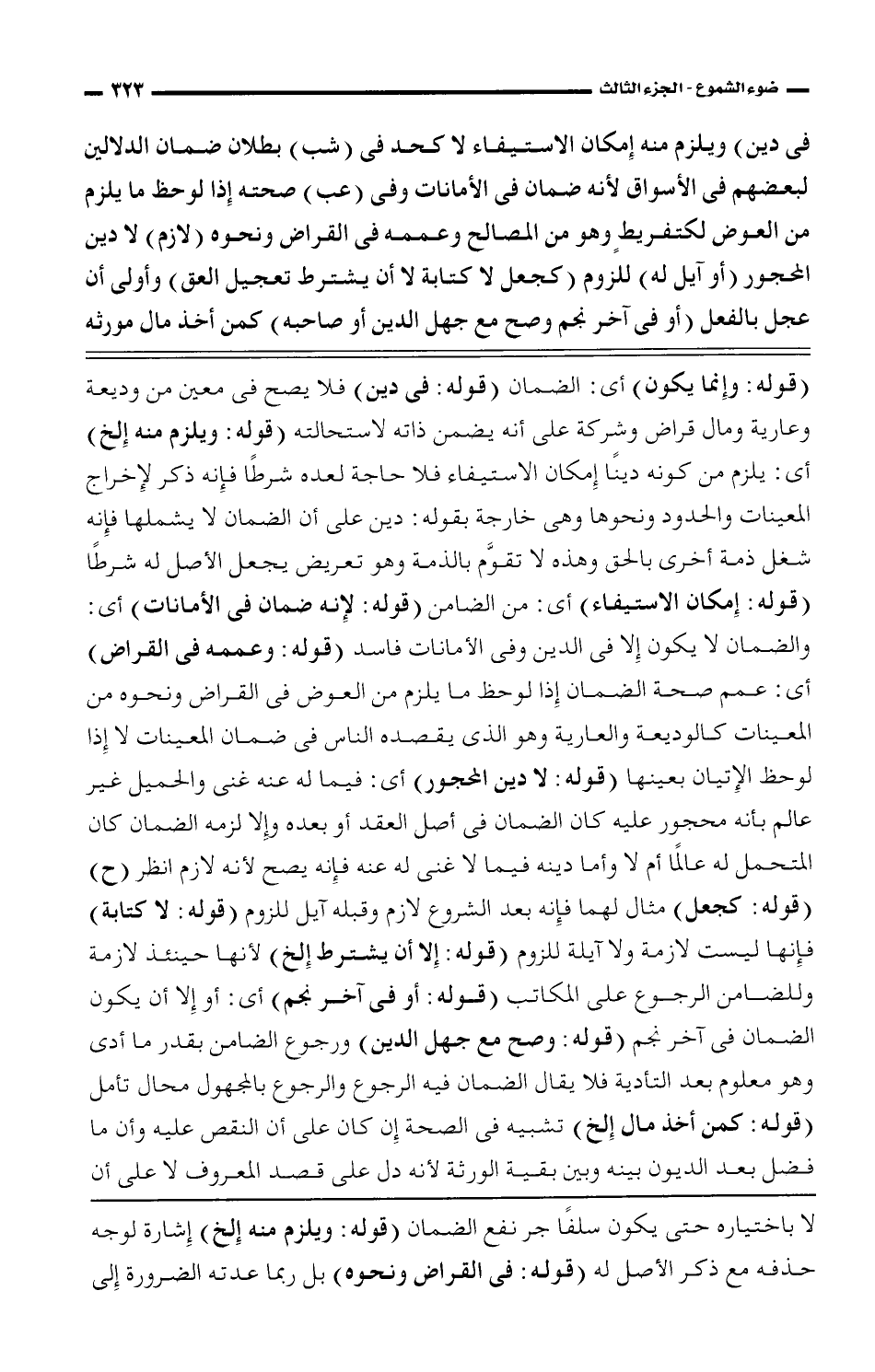 فى دين) ويلوم منه إمكان الاستيفاء لا كحد فى (شب) بطلان ضمان الدلالين لبعضهم فى الأسواق لأنه ضمان فى الأمانات وفى (عب) صحته إذا لوحظ ما يلزم من العوض لكتفريطٍ وهو من المصالح وعممه فى القراض ونحوه (لازم) لا دين المحجور (أو آيل له) للزوم (كجعل لا كتابة لا أن يشترط تعجيل العق) وأولى أن عجل بالفعل (أو فى آخر نجم وصح مع جهل الدين أو صاحبه) كمن أخذ مال مورثه