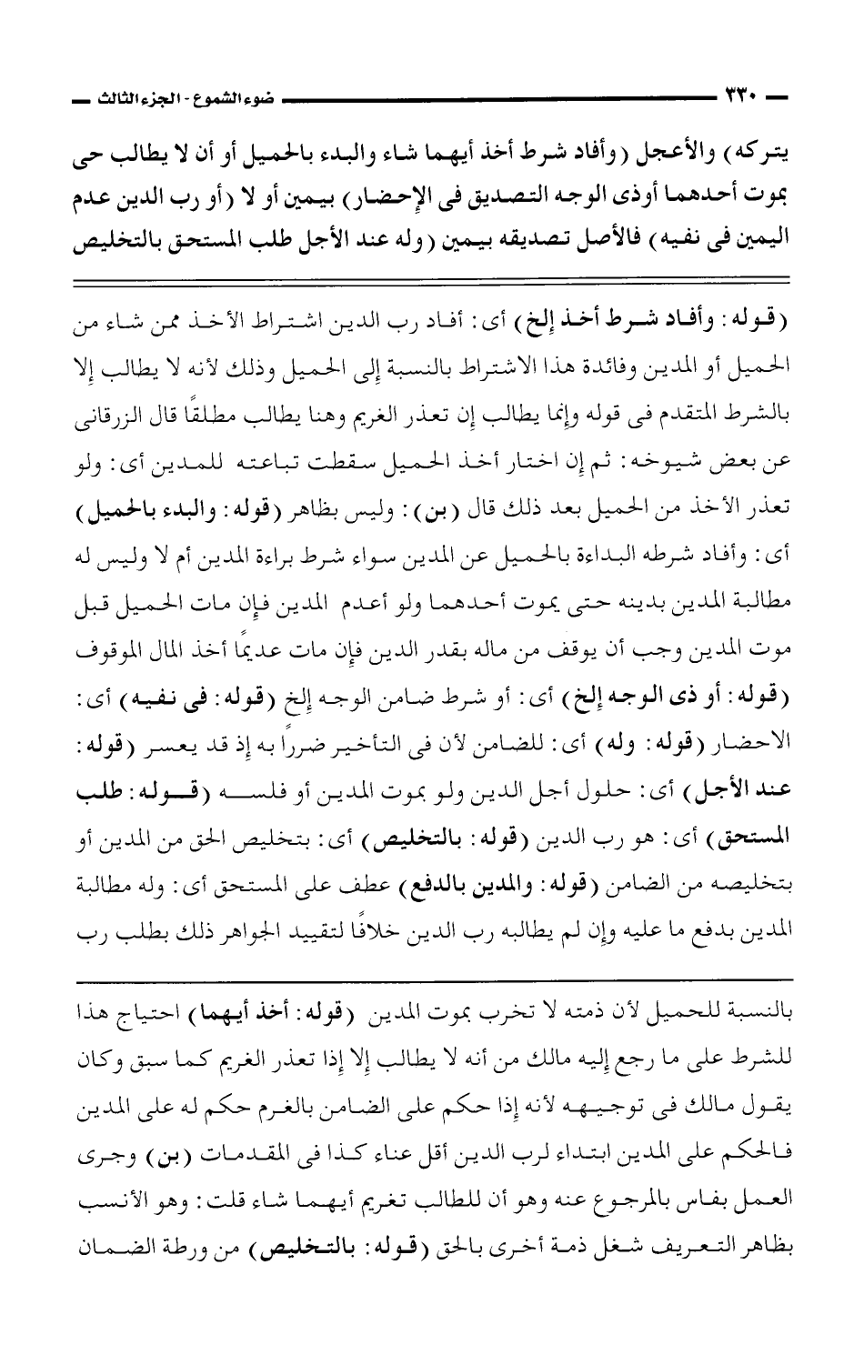 (قوله: وأفاد شرط أخذ إلخ) أى: أفاد رب الدين اشتراط الأخذ ممن شاء من الحميل أو المدين وفائدة هذا الاشتراط بالنسبة إلى الحميل وذلك لأنه لا يطالب إلا بالشرط المتقدم فى قوله وإنما يطالب إن تعذر الغريم وهنا يطالب مطلقًا قال الزرقانى عن بعض شيوخه: ثم إن اختار أخذ الحميل سقطت تباعته للمدين أى: ولو تعذر الأخذ من الحميل بعد ذلك قال (بن): وليس بظاهر (قوله: والبدء بالحميل) أى: وأفاد شرطه البداءة بالحميل عن المدين سواء شرط براءة المدين أم لا وليس له مطالبة المدين بدينه حتى يموت أحدهما ولو أعدم المدين فإن مات الحميل قبل موت الدين وجب أن يوقف من ماله بقدر الدين فإن مات عديمًا أخذ المال الموقوف (قوله: أو ذى الوجه إلخ) أى: أو شرط ضامن الوجه إلخ (قوله: فى نفيه) أى: الاحضار (قوله: وله) أى: للضامن لأن فى التأخير ضررًا به إذ قد يعسر (قوله: عند الأجل) أى: حلول أجل الدين ولو بمرت المدين أو فلسه (قوله: طلب المستحق) أى: هو رب الدين (قوله: بالتخليص) أى: بتخليص الحق من المدين أو بتخليصه من الضامن (قوله: والمدين بالدفع) عطف على المستحق أى: وله مطالبة المدين بدفع ما عليه وإن لم يطالبه رب الدين خلافًا لتقييد الجواهر ذلك بطلب رب