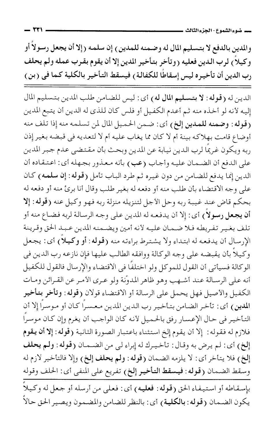 والمدين بالدفع لا بتسليم المال له وضمنه للمدين) إن سلمه (إلا أن يجعل رسولًا أو وكيلًا) لرب الدين فعليه (وتأخر بتأخير المدين إلا أن يقوم عمله ولم يحلف رب الدين أن تأخيره ليس إسقاطًا للكفاةلة) فيسقط التأخير بالكلية كما فى (بن)