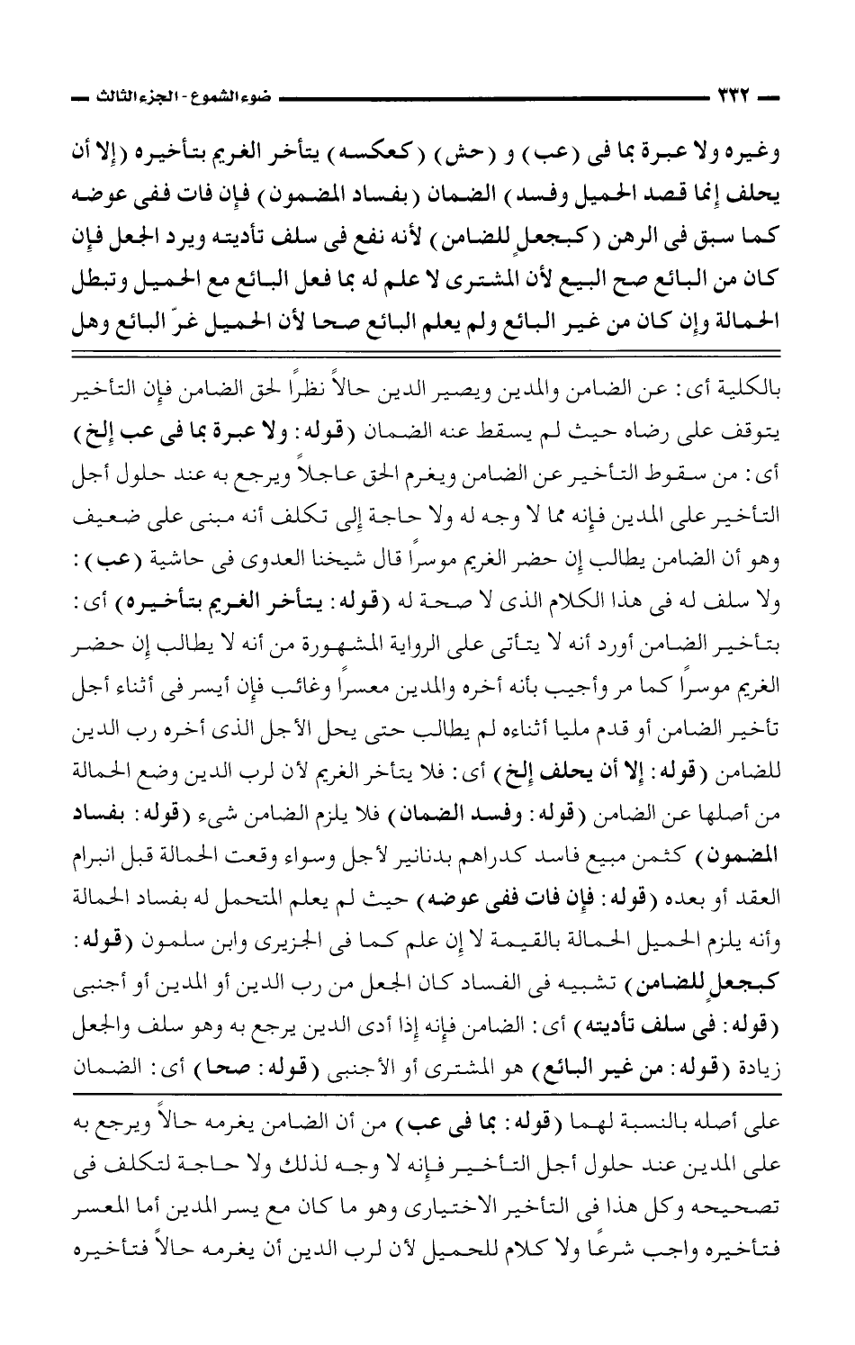 على أصله بالنسبة لهما (قوله: بما فى عب) من أن الضامن يغرمه حالًا ويرجع به على المدين عند حلول أجل التأخير فإنه لا وجه لذلك ولا حاجة لتكلف فى تصحيحه وكل هذا فى التأخير الاختيارى وهو ما كان مع يسر المدين أما العسر فتأخيره واجب شرعًا وكلام للحميل لأن لرب الدين أن يغرمه حالًا فتأخيره