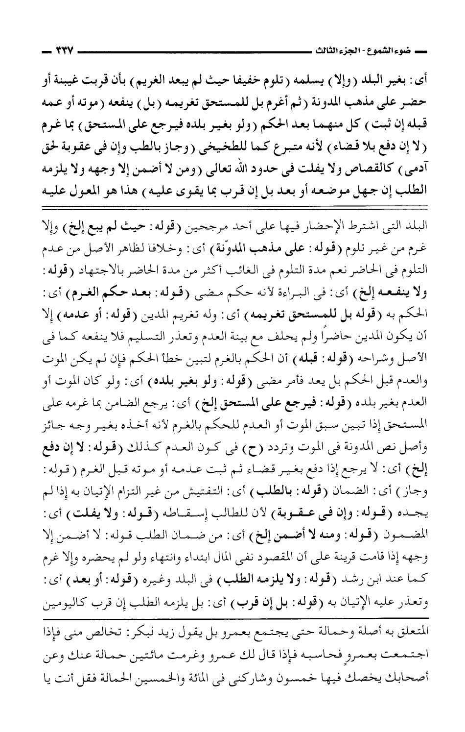 أى: بغير البلد (وإلا) يسلمه (تلوم خفيفا حيث لم يبعد الغريم) بأن قربت غيبنة أو حضر على مذهب المدونة (ثم غرم بل للمستحق تغريمه (بل) ينفعه (موته أو عمه قبله إن ثبت) كل منهما بعد الحكم (ولو بغير بدله فيرجع على المستحق) بما غرم (لا إن دفع بلا قضاء) لأنه متبرع كما للطخيخى (وجاز بالطب وإن فى عقوبة لحق آدمى) كالقصاص ولا يفلت فى حدود الله تعالى (ومن لا أضمن إلا وجهه ولا يلزمه الطلب إن جهل موضعه أو بعد بل إن قرب بما يقوى عليه) هذا هو المعول عليه