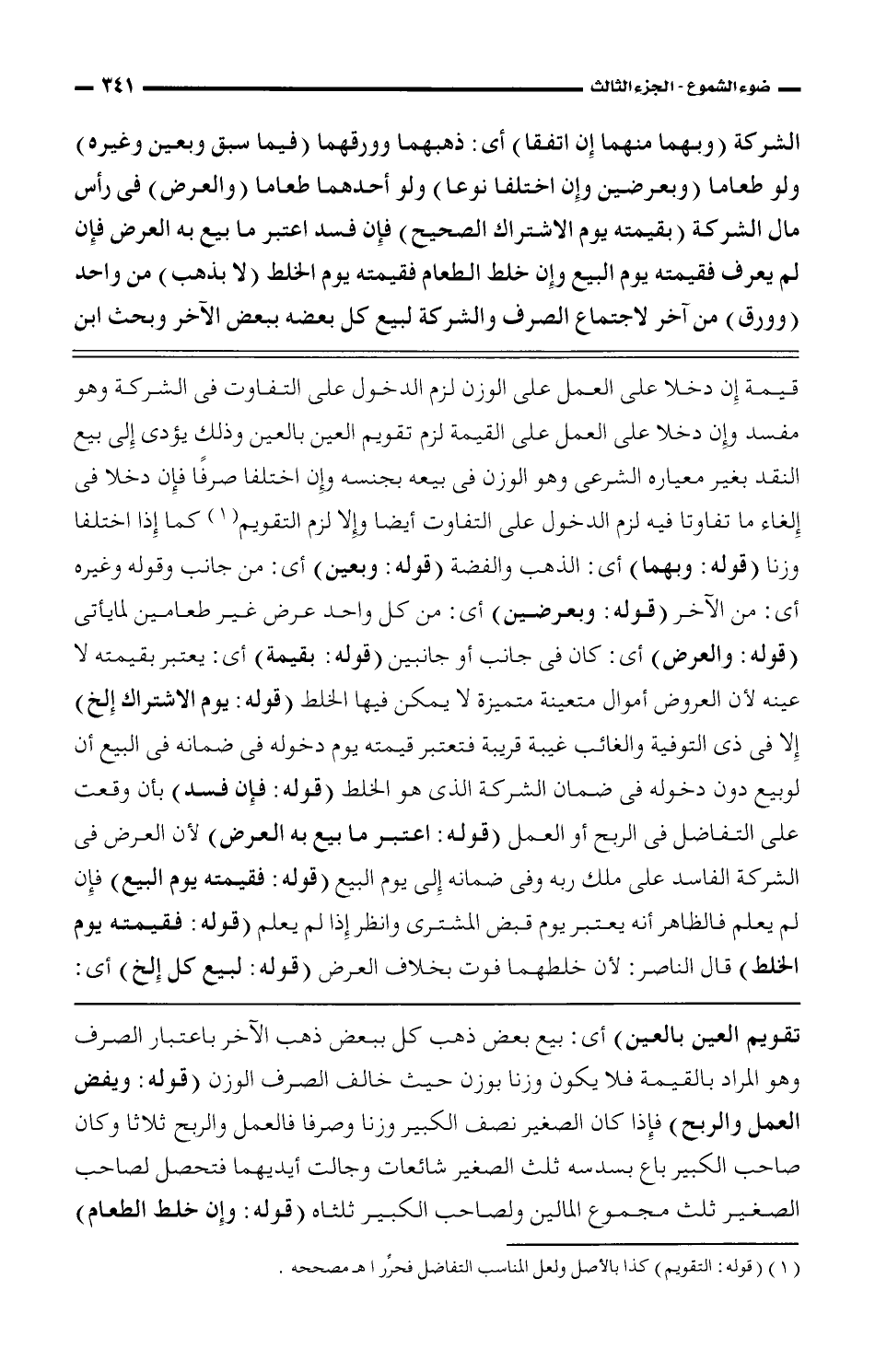 قيمة إن دخلا على العمل على الوزن لزم الدخول على التفاوت فى الشركة وهو مفسد وإن دخلا على العمل على القيمة لزم تقويم العين بالعين وذلك يؤدى إلى بيع النقد بغير معياره الشرعى وهو الوزن فى بيعه بجنسه وإن اختلفا صرفًا فإن دخلا فى إلغاء ما تفاوتا فيه لزم الدخول على التفاوت أيضا وإلا لزم التقويم كما إذا اختلفا وزنا (قوله: وبهما) أى: الذهب والفضة (قوله: وبعين) أى: من جانب وقوله وغيره أى: من الآخر (قوله: والعرضين) أى: من كل واحد عرض غير طعامين لما يأتى (قوله: والعرض) أى: كان فى جانب أو جانبين (قوله: بقيمة) أى: يعتبر بقيمته لا عينه لأن العروض أموال معينة متميزة لا يمكن فيها الخلط (قوله: يوم الاشتراك إلخ) إلا فى ذى التوفية والغائب غيبة قريبة فتعتبر قيمته بوم دخوله فى ضمانه فى البيع أن لوبيع دون دخوله فى ضمان الشركة الذى هو الخلط (قوله: فإن فسد) بأن وقعت على التفاضل فى الربح أن العمل (قوله: اعتبر ما بيع به العرض) لأن العرض فى الشركة الفاسد على ملك ربه وفى ضمانه إلى يوم البيع (قوله: فقيمته يوم البيع) فإن لم يعلم فالظاهر أنه يعتبر يوم قبض المشترى وانظر إذا لم يعلم (قوله: فقيمته يوم الخلط) قال الناصر: لأن خلطهما فوت بخلاف العرض (قوله: لبيع كل إلخ) أى: