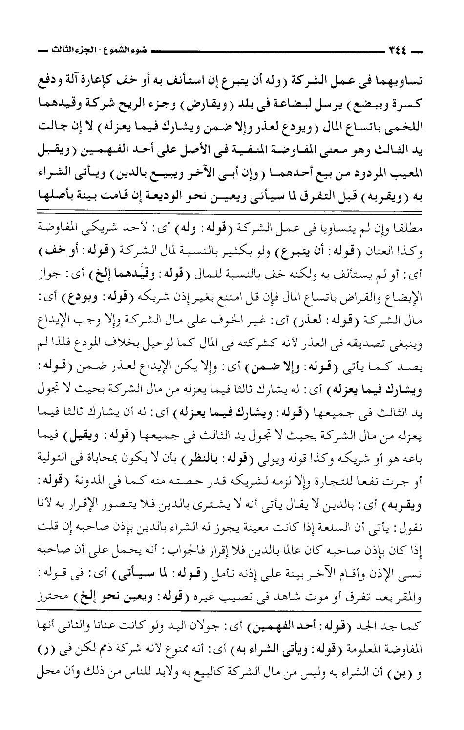 مطلقا وإن لم يتساويا فى عمل الشركة (قوله: وله) أى: لأحد شريكى المفاوضة وكذا العنان (قوله: أن يتبرع) ولو بكثير بالنسبة لمال الشركة (قوله: أو خف) أى: أو لم يستألف به ولكنه خف بالنسبة للمال (قوله: وقيَّدهما إلخ) أى: جواز الإبضاع والقراض باتساع المال فإن قل امتنع بغير إذن شريكه (قوله: ويودع) أى: مال الشركة (قوله: لعذر) أى: غير الخوف على مال الشركة وإلا وجب الإيداع وينبغى تصديقه فى العذر لأنه كشركته فى المال كما لو حيل بخلاف المودع فلذا لم يصد كما يأتى (قوله: وإلا ضمن) أى: وإلا يكن الإيداع لعذر ضمن (قوله: ويشارك فيما يعزله) أى: له يشارك ثالثا فيما يعزله من مال الشركة بحيث لا تجول يد الثالث فى جميعها (قوله: ويشارك فيما يعزله) أى: له أن يشارك ثالثا فيما يعزله من مال الشركة بحيث لا تجول يد الثالث فى جميعها (قوله: ويقيل) فيما باعه هو أو شريكه وكذا قوله ويولى (قوله: بالنظر) بأن لا يكون بمحاباة فى التولية أو جرت نفعا للتجارة وإلا لزمه لشريكه قدر حصته منه كما فى المدونة (قوله: ويقربه) أى: بالدين لا يقال يأتى أنه لا يشترى بالدين فلا يتصور الإقرار به لأنا نقول: يأتى أن السلعة إذا كانت معينة يجوز له الشراء بالدين بإذن صاحبه إن قلت إذا كان بإذن صاحبه كان عالما بالدين فلا إقرار فالجواب: أنه يحمل على أن صاحبه نسى الإذن وأقام الآخر بينة على إذنه تأمل (قوله: لما سيأتى) أى: فى قوله: والمقر بعد تفرق أو موت شاهد فى نصيب غيره (قوله: ويعين نحو إلخ) محترز