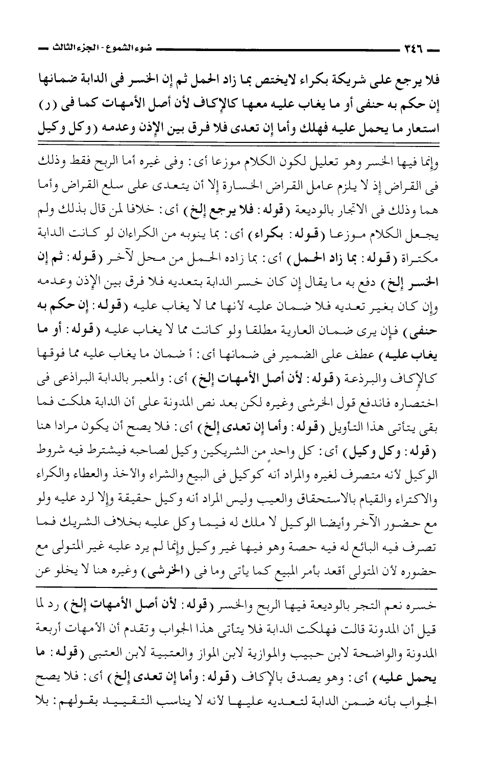 وإنما فيها الخسر وهو تعليل لكون الكلام موزعا أى: وفى غيره أما الربح فقط وذلك فى القراض إذ لا يلزم عامل القراض الخسارة إلا أن يتعدى على سلع القراض وأما هما وذلك فى الاتجار بالوديعة (قوله: فلا يرجع إلخ) أى: خلافا لمن قال بذلك ولم يجعل الكلام موزعا (قوله: بكراء) أى: بما ينوبه من الكراءان لو كانت الدابة مكتراة (قوله: بما زاد الحمل) أى: بما زاده الحمل من محل لآخر (قوله: ثم إن الخسر إلخ) دفع به ما يقال إن كان خسر الدابة بتعديه فلا فرق بين الإذن وعدمه وإن كان بغير تعديه فلا ضمان عليه لأنها مما لا يغاب عليه (قوله: إن حكم به حنفى) فإن يرى ضمان العارية مطلقا ولو كانت مما لا يعاب عليه (قوله: أو ما يغاب عليه) عطف على الضمير فى ضمانها أى: أضمان ما يغاب عليه مما فوقها كالإكاف والبرذعة (قوله: لأن أصل الأمهات إلخ) أى: والمعبر بالدابة البراذعى فى اختصاره فاندفع قول الخرشى وغيره لكن بعد نص المدونة على أن الدابة هلكت فما بقى يتأتى هذا التأويل (قوله: وأما إن تعدى إلخ) أى: فلا يصح أن يكون مرادا هنا (قوله: وكل وكيل) أى: كل واحدٍ من الشريكين وكيل لصاحبه فيشترط فيه شروط الوكيل لأنه متصرف لغيره والمراد أنه كوكيل فى البيع والشراء والأخذ والعطاء والكراء والاكتراء والقيام بالاستحقاق والعيب وليس المراد أنه وكيل حقيقة وإلا لرد عليه ولو مع حضور الآخر وأيضا الوكيل لا ملك له فيما وكل عليه بخلاف الشريك فما تصرف فيه البائع له فيه حصة وهو فيها غير وكيل وإنما لم يرد عليه غير المتولى مع حضوره لأن المتولى أقعد بأمر المبيع كما يأتى وما فى (الخرشى) وغيره هنا لا يخلو عن