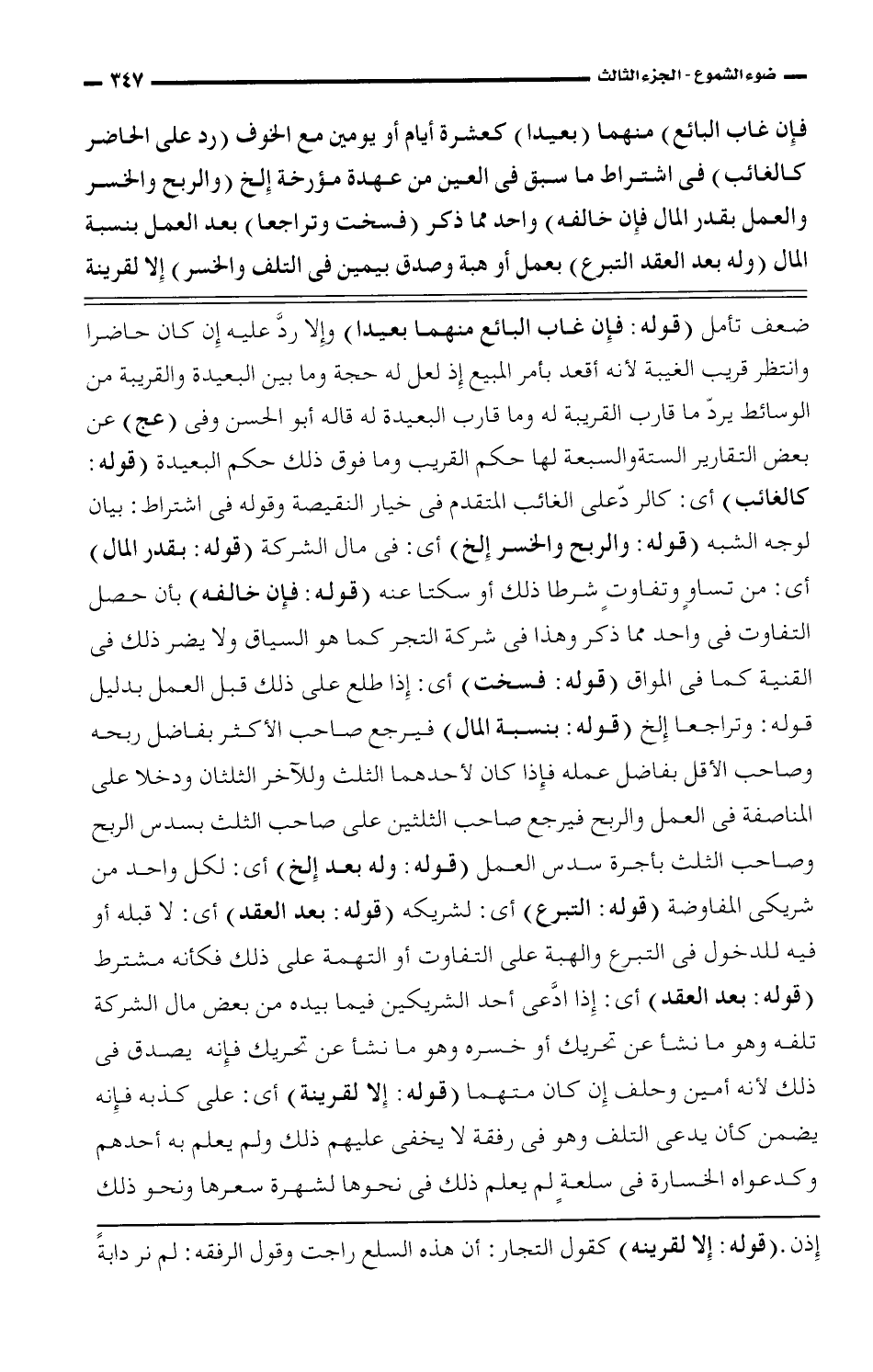ضعف تأمل (قوله: فإن غاب البائع منهما بعيدًا) وإلا ردَّ عليه إن كان حاضرا وانتظر قريب الغيبة لأنه أبعد بأمر المبيع إذ لعل له حجة وما بين البعيدة والقريبة من الوسائط يردّ ما قارب القريبة له وما قارب البعيدة له قاله أبو الحسن وفى (عج) عن بعض التقارير الستة والسبعة لها حكم القريب وما فوق ذلك حكم البعيدة (قوله: كالغائب) أى: كالردّ على الغائب المتقدم فى خيار النقيصة وقوله فى اشتراط: بيان لوجه الشبه (قوله: والربح والخسر إلخ) أى: فى مال الشركة (قوله: بقدر المال) أى: من تساوٍ وتفاوتٍ شرطا ذلك أو سكتا عنه (قوله: فإن خالفه) بأن حصل التفاوت فى واحد مما ذكر وهذا فى شركة التجر كما هو السياق ولا يضر ذلك فى القنية كما فى المواق (قوله: فسخت) أى: إذا طلع على ذلك قبل العمل بدليل قوله: وتراجعا إلخ (قوله: بنسبة المال) فيرجع صاحب الأكثر بفاضل ربحه وصاحب الأصل بفاضل عمله فإذا كان لأحدهما الثلث وللآخر الثلثان ودخلا على المناصفة فى العمل والربح فيرجع صاحب الثلثين على صاحب الثلث بسدس الربح وصاحب الثلث بأجرة سدس العمل (قوله: وله بعد إلخ) أى: لكل واحد من شريكى الفاوضة (قوله: التبرع) أى: لشريكه (قوله: بعد العقد) أى: لا قبله أو فيه للدخول فى التبرع والهبة على التفاوت أو التهمة على ذلك فكأنه مشترط (قوله: بعد العقد) أى: إذا اَّدعى أحد الشريكين فيما بيده من بعض مال الشركة تلفه وهو ما نشأ عن تحريك أو خسره وهو ما نشأ عن تحريك فإنه يصدق فى ذلك لأنه أمين وحلف أن كان متهما (قوله: إلا لقرينة) أى: على كذبه فإنه يضمن كأن يدعى التلف وهو فى رفقة لا يخفى عليهم ذلك ولم يعلم به أحدهم وكدعواه الخسارة فى سلعة لم يعلم ذلك فى نحوها لشهرة سعرها ونحو ذلك